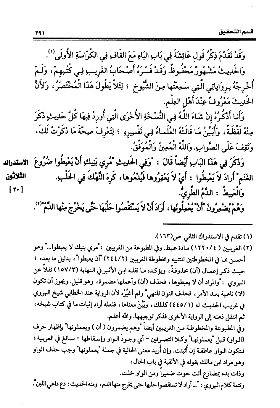 وذكر في هذا الباب أيضاً، قال: وفي الحديث: مُرِي بنيكِ أنْ يَعْبطوا ضروعَ الغنم، أراد: لا يَعْبطوا، أي لا يعقروها فيدموها، كرهَ النَّهكَ، في الحلب والعبيطُ: الدمُ الطريّ، وهم يضمرون أنْ ويعملونها، أراد ألا يستقصوا حلبها حتى يخرج منها الدمُ.