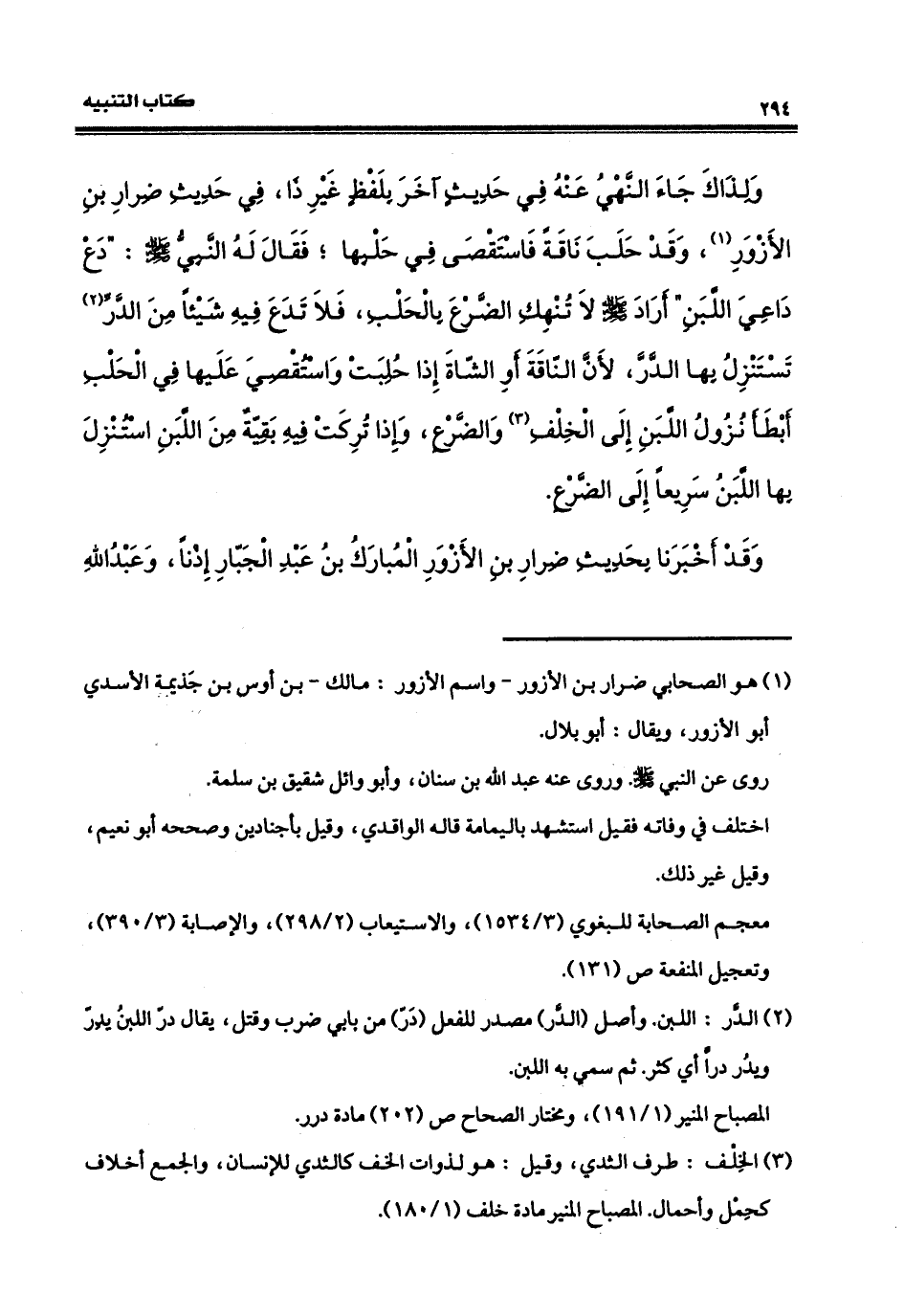 ولذلك جاء النَّهيُ عنه في حديث آخر بلفظٍ غير ذا في حديث ضرار بن الأزور، وقد حلب ناقةً واستقصى في حلبها، فقال له النبيّ صلى الله عليه وسلم: دعْ داعيَ اللبنِ، أراد صلى الله عليه وسلم: لا تنهك الضّرع بالحلب، فلا تدع فيه شيئاً من الدّرّ تستنزل بها الدّرّ لأن الناقة أو الشاة إذا حلبت، واستقصي عليها في الحلب أبطأ نزول اللبن إلى الخلف والضّرع، وإذا تركت فيه بقية من اللبن استنزل بها اللبن سريعاً إلى الضّرع. وقد أخبرنا بحديث ضرار بن الأزور، المبارك بن عبد الجبار إذناً، وعبد الله