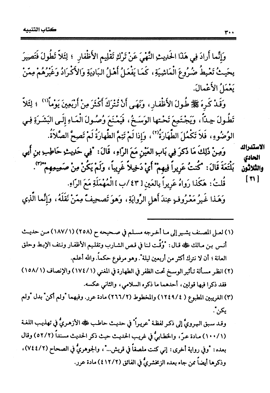 ومن ذلك ما ذكر في باب (العين مع الراء)، قال: في حديث حَاطب بن أبي بَلْتَعَةَ، قال: كنتُ عَريراً فيهم، أي دخيلاً غريباً ولم أكنْ من صميمهم. قلت: هكذا رواه: عَريراً - بالعين - المهملة مع الراء، وهذا غير معروف عند أهل الرواية، وهو تصحيفٌ ممّن نقله. وإنّما الذي