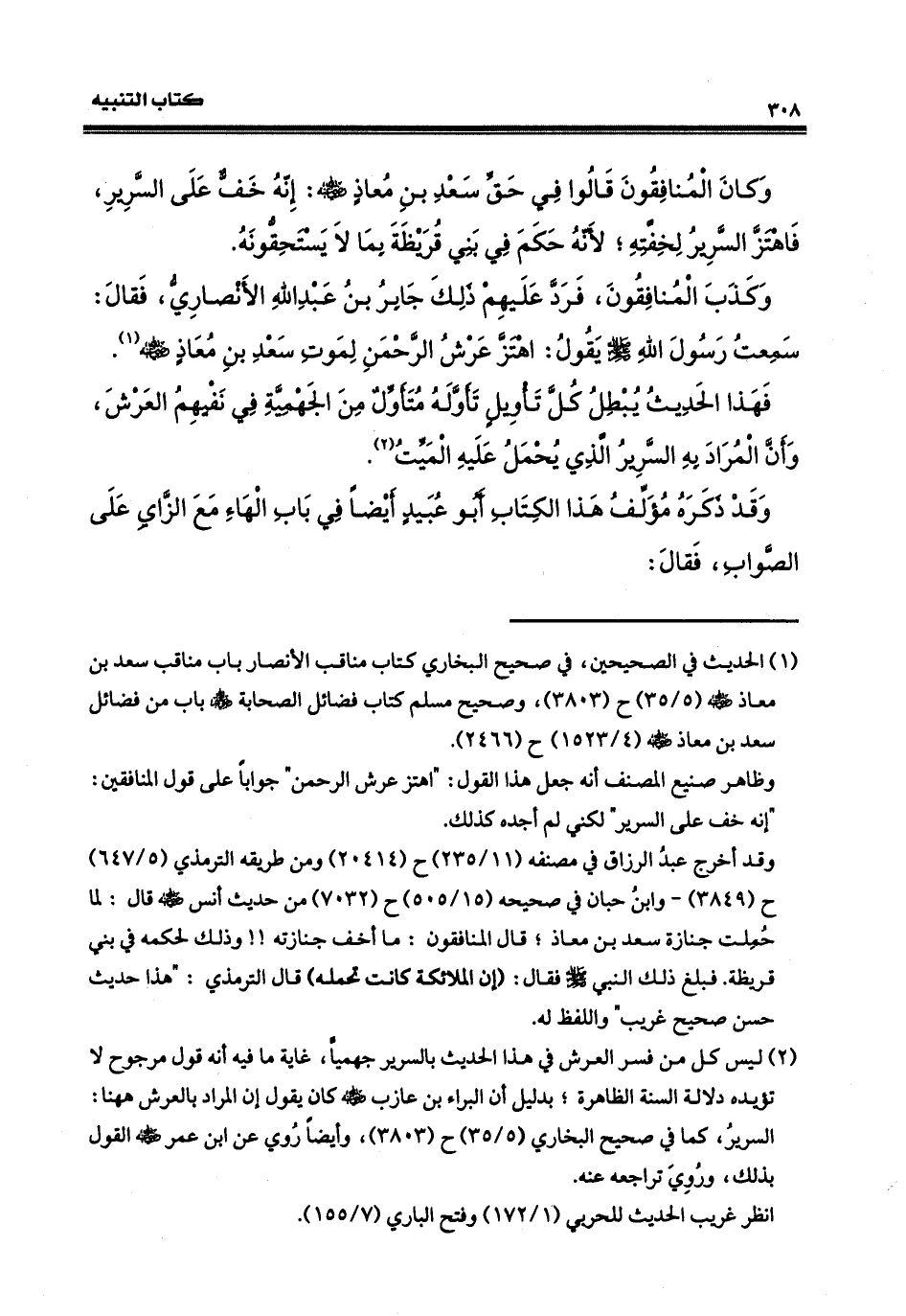 وكان المنافقونَ قالوا في حقّ سعد بن معاذٍ رضي الله عنه، أنه خفَّ على السرير، فاهتزَّ السرير لخفته، لأنّه حكم في بني قريظةَ بما لا يستحقّونَه، وكذب المنافقون، فردَّ عليهم ذلك جابر بن عبد الله الأنصاري فقالَ: سمعت رسول الله، صلى الله عليه وسلم يقولَ: اهتَّز عرش الرحمن لموت سعدِ بن معاذٍ، رضيَ اللهُ عنه. فهذا الحديث يُبْطِلُ كلَّ تأويل تأولَه متأوِّلُ مِنَ الجهميةِ في نفيهم العرشَ، وأنَّ المراد به السريرُ الذي يُحْمل عليهِ الَميْتُ. وقد ذكره مؤلف هذا الكتاب، أبو عبيد أيضاً في باب (الهاء مع الزاي) على الصواب، فقال: