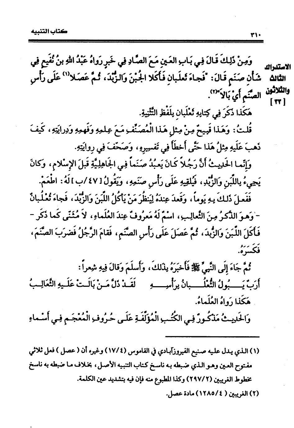 ومن ذلك قال في باب العين مع الصاد في خبر رواه عبد اللهِ بنُ نُفَيْعٍ في شأن صنم، قال: فجاء ثَعلبان فأكلا الجُبن والزُّبدَ، ثم عَصَلا على رأسِ الصنم، أيِ: بالا. هكذا ذكره في كتابه ثَعْلبانِ بلفظ التثنية.