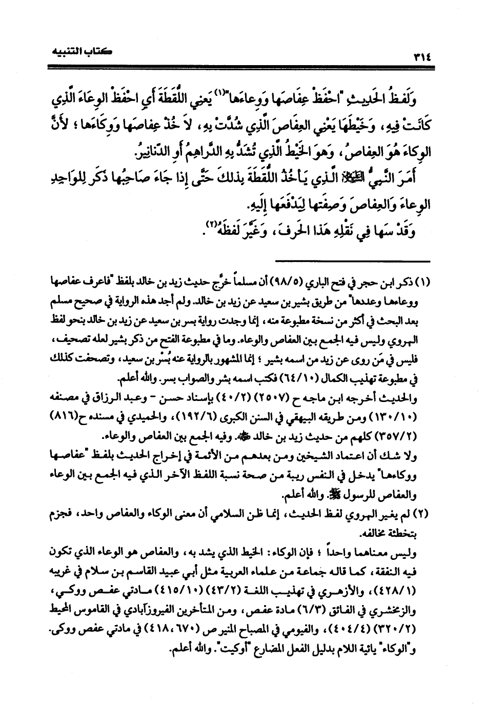 الذي شُدَّتْ به، لا خذْ عِفَاصها ووكاءَها، لأن الوكاءَ هو العفاصَ، وهو الخيط الذي تُشَدْ به الدراهم أو الدنانير. أمرَ النبيَّ، صلى الله عليه وسلم، الذي يأخذ اللقطة بذلك، حتى إذا جاءَ صاحبُها، ذكر للواجد الوعاء، والعفاصَ وصفتها ليدفعها إليه، وقد سسها في نقله هذا الحرف وغيَّر لفظه.