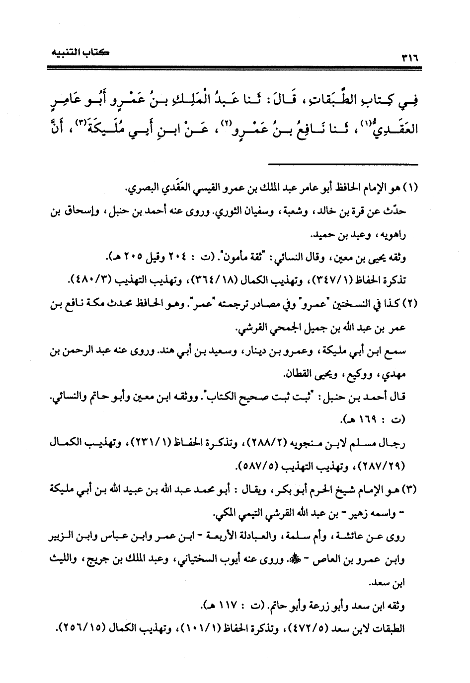 في كتاب (الطبقات)، قال: ثنا عبدُ الملكِ بن عمرو أبوعامر العَقديّ، ثنا نافع بُن عمرو عن أبي مُلَيكة أنّ