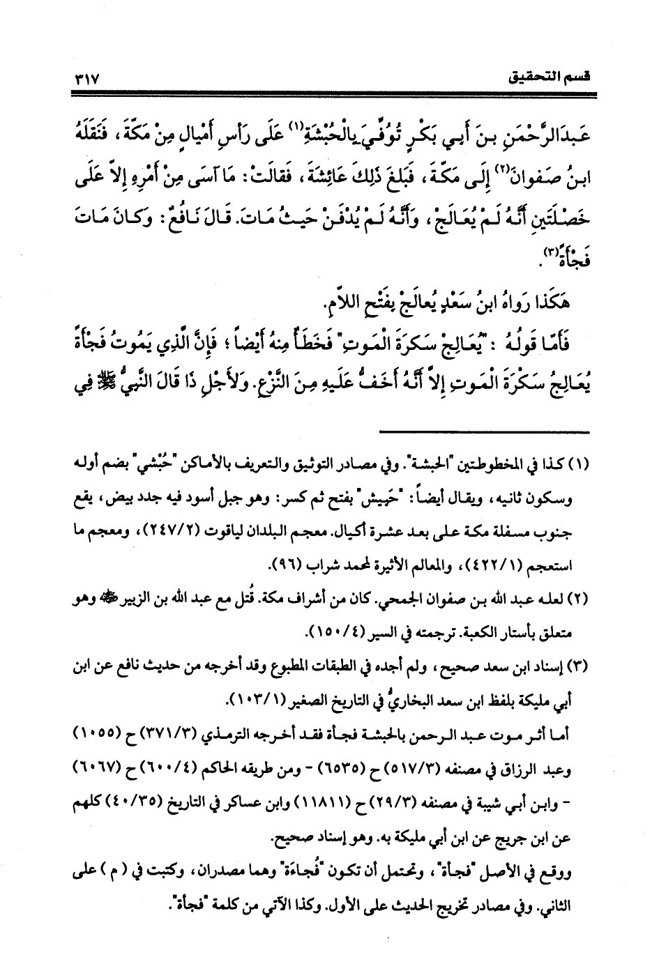 عبدَ الرحمنِ بنَ أبي بكر توفي بالحُبشيِّ على رأسِ أميال من مكة، فنقله ابنُ صفوانَ إلى مكَّةَ، فبلغ ذلك عائشةَ فقالت: ما آسى من أمرهِ إلاّ على خَصْلَتين، أنَّه لم يعالَجْ، وأنَّه لم يُدْفَن حيثُ ماتَ. قال نافعُ: وكانَ ماتَ فجأةً. هكذا رواه ابنُ سعدٍ يعالَج بفتح اللام، فأما قوله: يُعَالجُ سكرةَ الموتِ فخطأٌ منهُ أيضاً، فإنّ الذي يموتُ فجأةً يعالجُ سَكْرةَ الموتِ، إلاّ أنه أخفّ عليه من النّزع، ولأجلِ ذلك قال النبُّي، صلى الله عليه وسلم، في