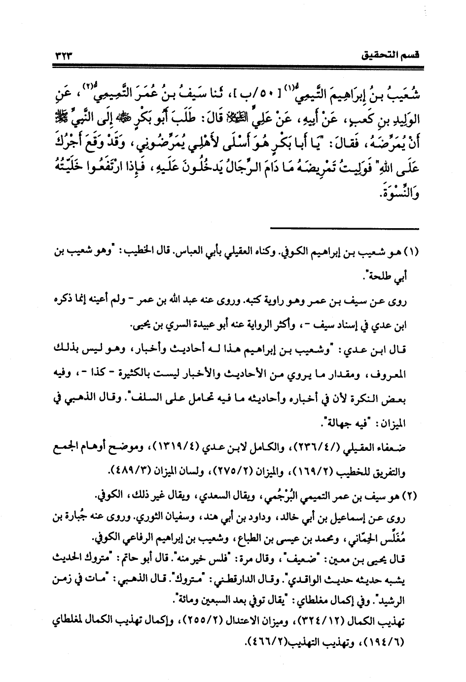 شعيبُ بنُ إبراهيم التميمي ثنا سيفُ بنُ عمر التميمي، عن الوليد بن كعب عن أبيه، عن عليٍّ، عليه السلام، قال: هو أسلى لأهلي يمرضّوني وقد وقع أجرك على الله. فولّيت تمريضه ما دام الرجال يدخلون عليه، فإذا ارتفعوا خلّيته والنسوة.