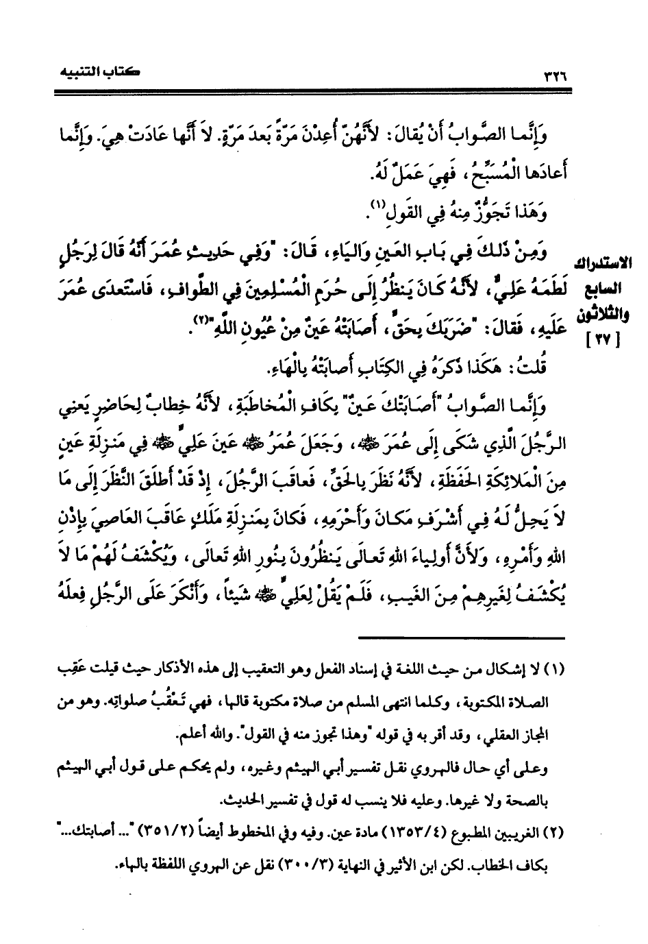 ومن ذلك في باب (العين والياء)، قال: وفي حديث عُمَر أنّه قال لرجلٍ لطَمَهُ عليٌّ لأنه كان ينظُر إلى حرَمِ المسلمين في الطوافِ فاستَعْدى عُمَرَ عليه فقالَ: ضَربَكَ بحقٍّ أصابته عينٌ من عيونِ الله.
