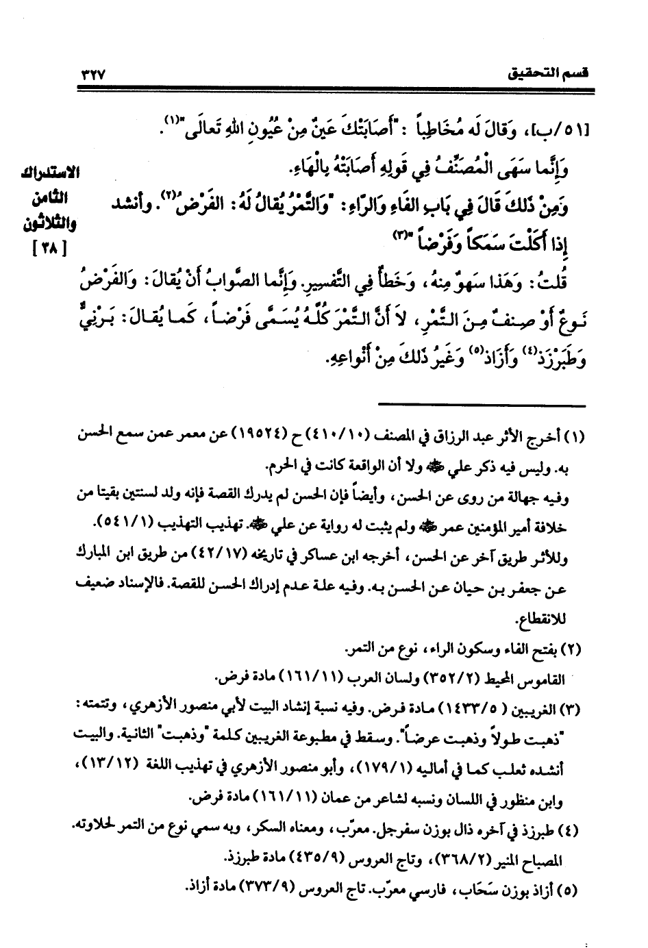 قلتُ: وهذا سهوٌ منه وخطأٌ في التفسيِر، وإنما الصوابُ أنْ يُقالَ: والفَرْض نوعٌ أو صنفٌ من التَّمرِ، لا أن التمرَ كلّه يسمى فرضاً كما يقال: برنيّ، وطَبَرْزَذ، وأَزاذٌ، وغير ذلكَ منْ أنواعِه.