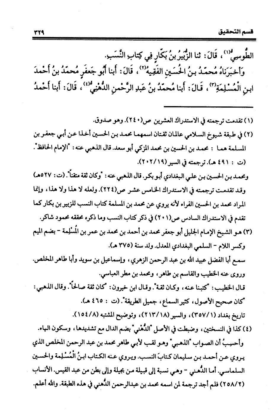 الطُّوسيّ، قال: ثنا الزبيرُ بنُ بكّارٍ في كتاب النّسَبِ. وأخبرنا محمدُ بنُ الحسينِ بنِ الفقيه، قال: أنبأ أبو جعفر محمد بن أحمد بن المُسلِمة، قال: أنبأنا محمد بن عبد الرحمن الذهبيّ، قال: أنبأ أحمدُ