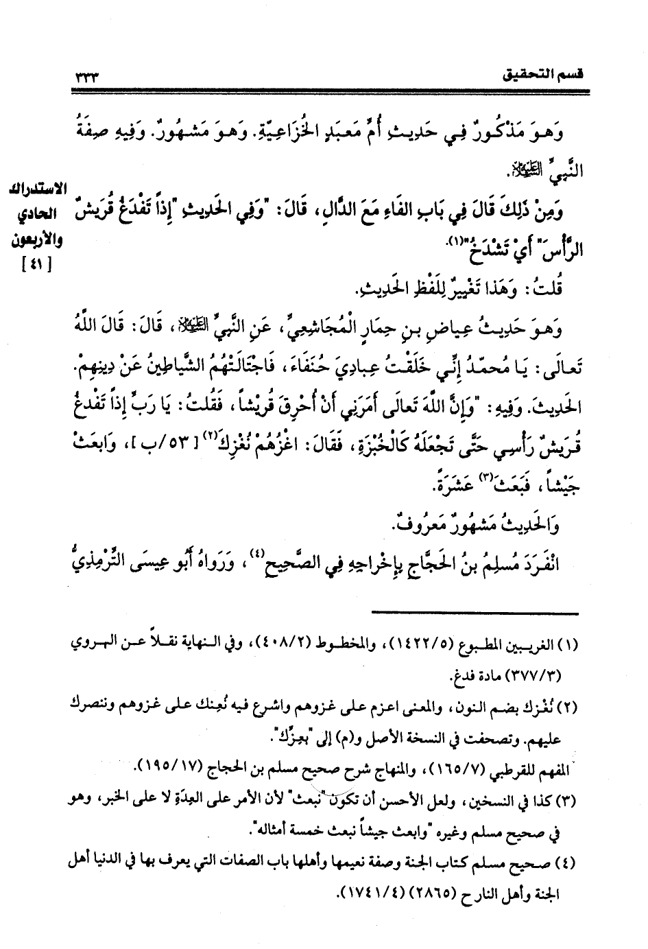 قلتُ: وهذا تغييرٌ للفظِ الحديثِ، وهو حديثُ عِياض بنِ حِمار المُجاشعيّ، عن النبيّ عليه السّلام قالَ: قال الله تعالى: يا محمّدُ إنيِّ خَلقتُ عباديَ حُنَفاءَ أُحرِّق، فاجْتَالتهم الشياطينُ عنْ دينهم، الحديث، وفيه: وإنّ اللهَ تعالى أمرني أن أَحَرِّقَ قريشاً فقلتُ: يا ربِّ إذاً تشدخُ قريشٌ رأسي، حتّى تجعَلَهُ كالخُبْزةِ، فقال: اغزُهُم نُغَزِّك وابعثْ جيشاً، فبعثَ عشرة.