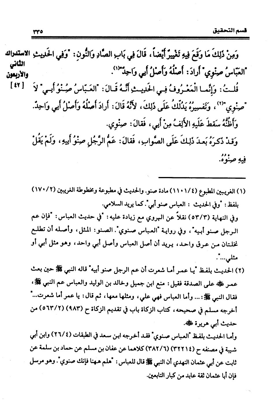 ومن ذلك ما وقعَ فيه تغييرٌ أيضاً، قال في باب (الصاد والنون) وفي الحديث: العبّاس صِنْوي، أراد: أصلُه وأصْلُ أبي واحدٌ.