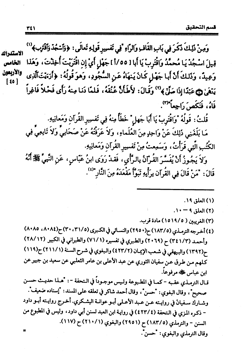 قلتُ: قوله: واقترب يا أبا جهل خطأ منه في تفسير القرآن ومعانيه، ما بلغني ذلك عن واحد من العلماء ولا عرفته عن صحابي ولا تابعي في الكتب التي قرأت وسمعت من تفسير القرآن ومعانيه، ولا يجوز أنْ يُفسَّر القرآن بالرأي. فقد روى ابنُ عبّاس عنِ النبيّ، صلى الله عليه وسلم أنّه قال: مَنْ قال في القرآن برأيه تبوّأ مقعده منَ النار.