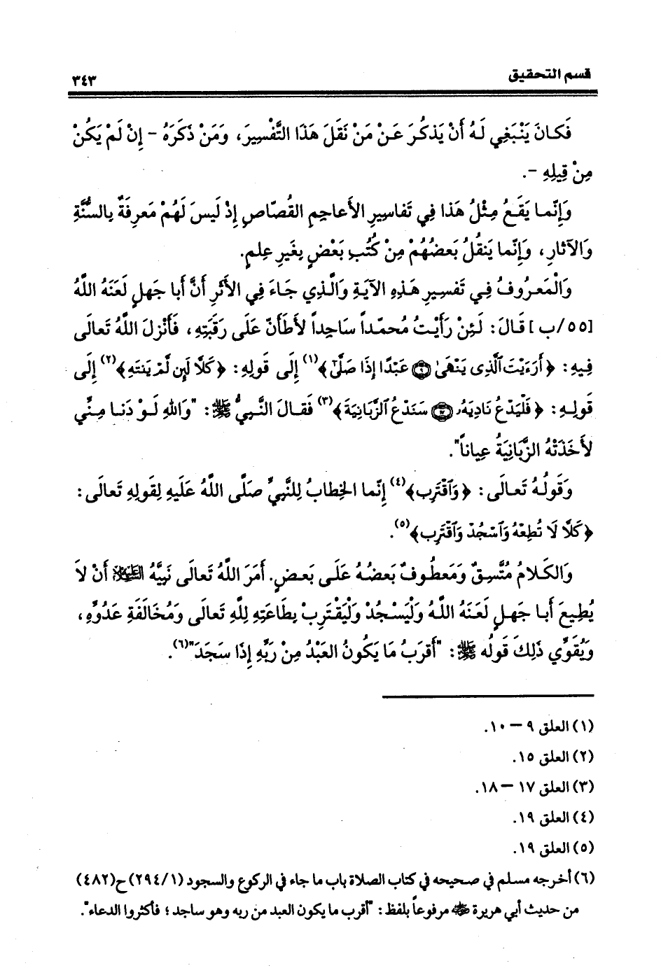 إلى قوله: (فَلْيَدْعُ نَاديَه، سندْعُ الزّبانيةَ)، فقال النبيّ، صلى الله عليه وسلم: والله لو دَنَا منّي لأخذته الزبانية عِيانا. وقوله تعالى: (واسجُد واقتربْ) إنما الخطاب للنبيّ، صلى الله عليه وسلم، لقوله تعالى: (كَلاَّ، لا تُطِعْهُ واسجُد واقتربْ).