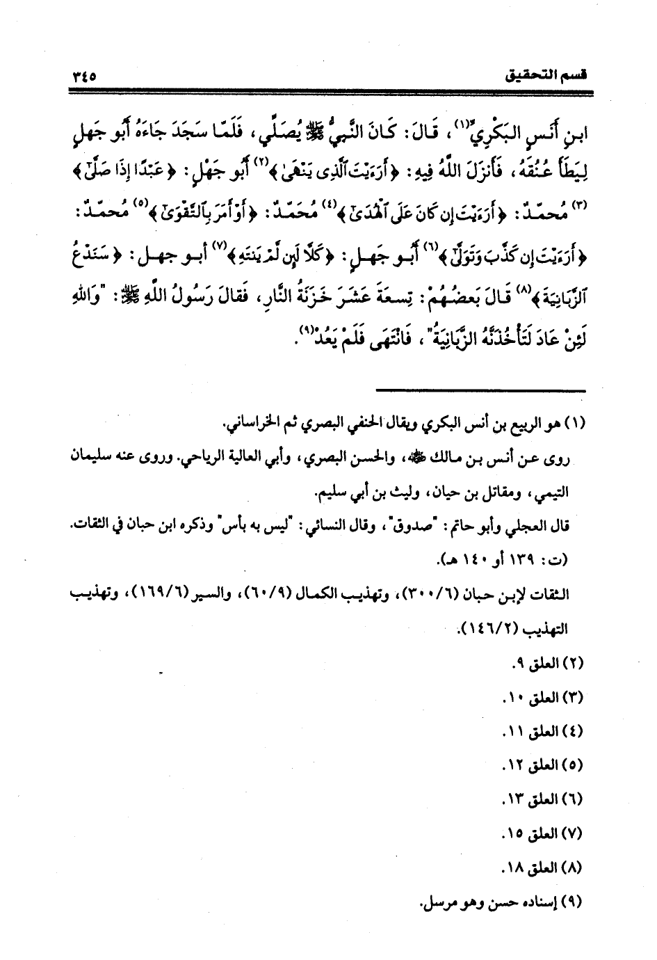 بنِ أنسٍ البكريِّ، قال: كان النبي، صلى الله عليه وسلم، يُصلّي فلمّا سجدَ جاءَ أبو جهلٍ ليطأَ عُنُقَه، فأنزل الله فيه: (أرأيت الذي يَنْهى، عبدأ إذا صلّى)؟ محمّد! (أرأيتَ إن كانَ على الهُدى)؟ محمّد (أو أَمَرَ بالتَّقوى)؟ محمّد! (أرأيتَ إنْ كذّب وتولّى)؟ أبو جهل (كَلا لَئِنْ لم يَنْتهِ)، أبو جهل (سَنَدْعُ الزبانية) قال بعضهم: (تسعةَ عَشَر): خَزَنة النار، فقالَ رسول الله صلى الله عليه وسلم: والله لئن عادَ لتأخُذَنّه الزبانيةُ، فانتهى فلم يعد.