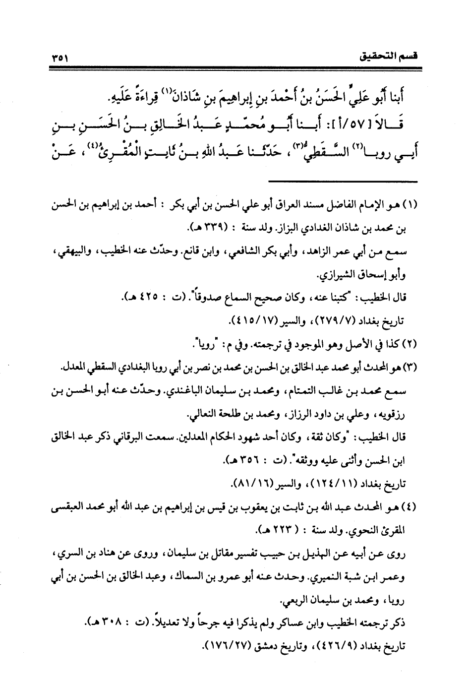 أنبأ أبو عليٍّ الحسنُ بن حمد بن إبراهيم بنِ شاذان، قراءةً عليه قالا: أنبأ أبو محمّد عبد الخالقِ بنُ الحسنِ بنِ أبي رويا السّقطي، حدّثنا عبدُ الله بنُ ثابت المُقرئ عن