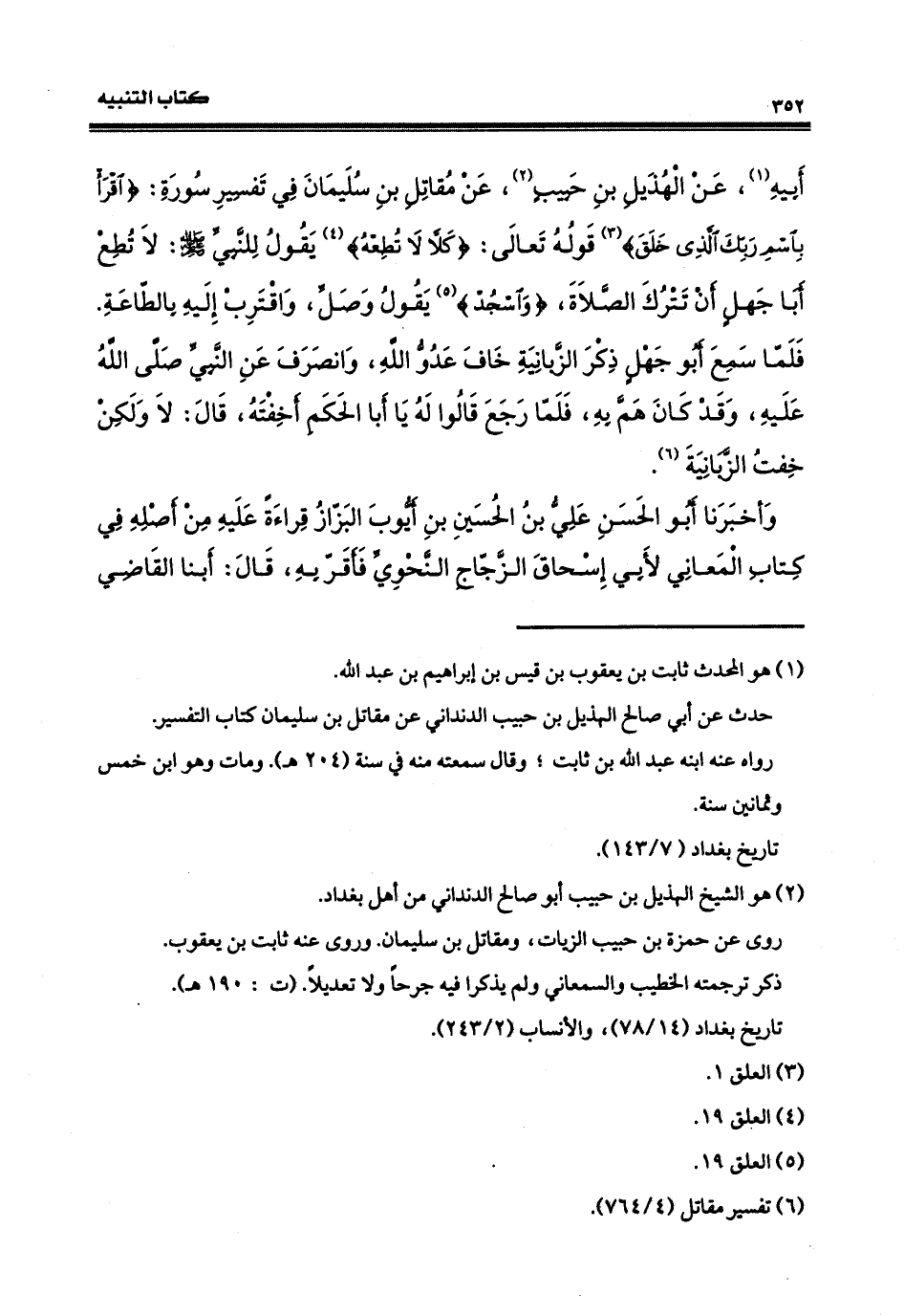 أبيه، عن الهذيل بن حبيبٍ، عن مقاتلِ بنِ سليمانَ في تفسيرِ سورة (اقرأْ باسمِ ربّك)، قوله تعالى: (كلا لا تطعه)، يقول للنبي، صلى الله عليه وسلم: لا تطعْ أبا جهل أن تترك الصلاةَ، و (اسجد)، يقول: صَلِّ واقتربْ إليه بالطاعةِ. فلمّا سمع أبو جهل ذِكْرَ الزبانيةِ خاف عدوّ الله وانصرفَ عنِ النبيّ، صلى الله عليه وسلم، وقد كانَ همَّ به. فلمّا رجعَ قالوا لهُ: يا أبا الحكم أَخِفَتَه؟ قال: لا، ولكن خِفْتُ الزبانيةَ.