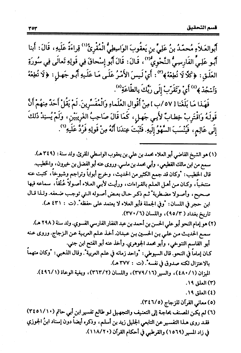 قال أبو إسحق في قوله تعالى في سورة العلق: (كلا لاتطعه)، أي: ليس الأمر على ما عليه أبو جهلٍ، لا تُطِعْه واسجُد، أي: وتقرّب إلى ربّك بالطاعة. فهذا ما بلغنا منْ أقوال العلماءِ والمفسّرين، لم يقلْ أحدٌ منهم: إن قوله: (واقتربْ) خطابٌ لأبي جهل كما قال صاحب الغريبين، ولم يُسْند ذلك إلى عالمٍ فينسبَ السهوُ إليه فثبتَ عندَنا أنّه منْ قوله فَرُدَّ عليه.