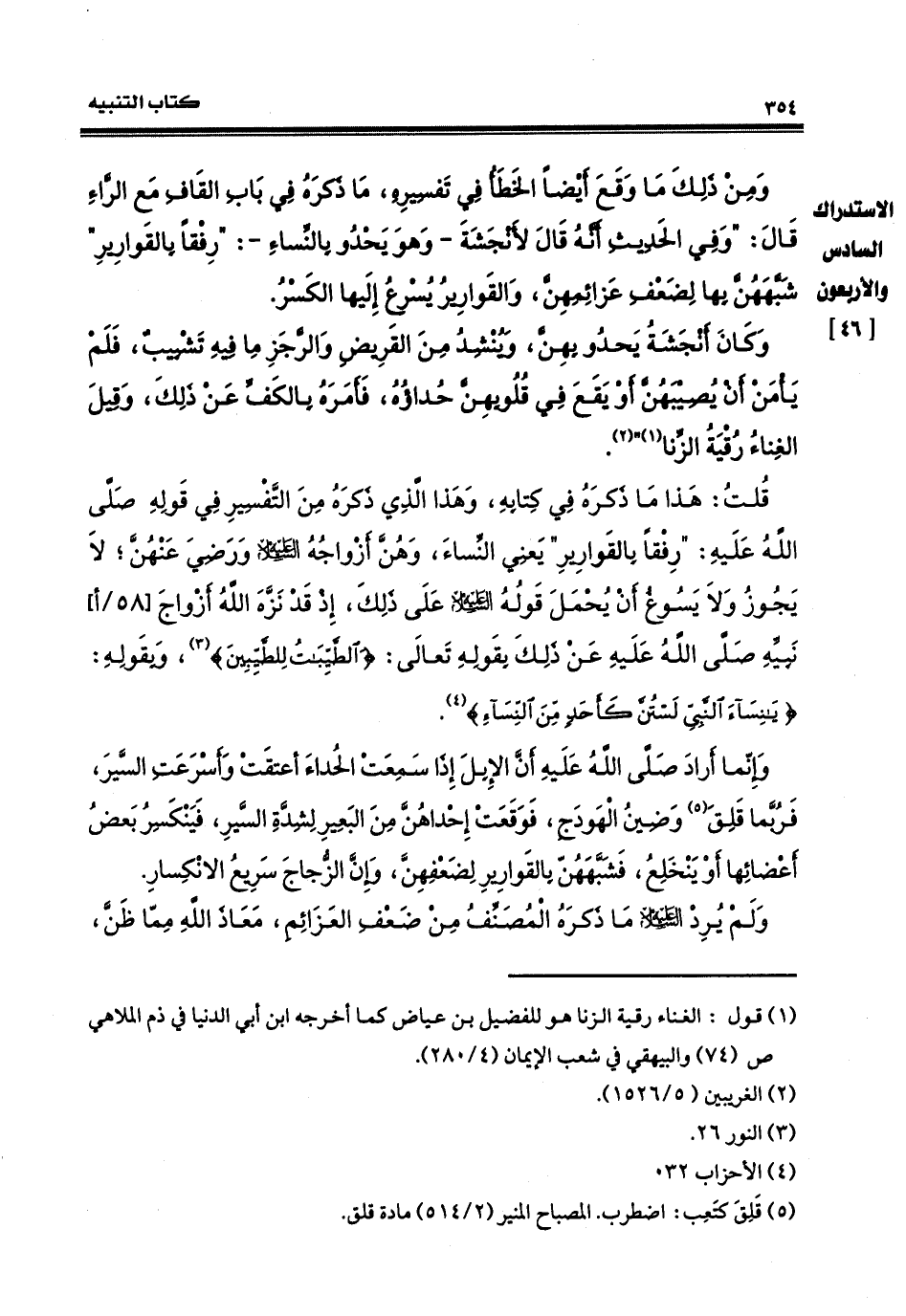 قلت: هذا ما ذكره في كتابه، وهذا الذي ذكره من التفسير قول، صلى الله عليه وسلم رفقاً بالقوارير، يعني النساء، وهنّ أزواجه عليه السلام، ورضيَ الله عنهنّ، لا يجوز ولا يسوغُ أن يُحْمَل قولُه عليه السلام، على ذلك، إذ قد نزّه الله أزواج نبيّه، صلى الله عليه وسلم، عن ذلك بقوله تعالى: (والطيّبات للطيّبين)، قوله: (يا نساءَ النبيّ لستنّ كأحدٍ منَ النساءِ)، وإنما أراد صلى الله عليه وسلم أنَّ الإبل إذا سمعتِ الحداءَ أَعْنَقتْ وأسرعتِ السّير، فربّما قَلِقَ وضينُ الهودج فوقعتْ إحداهنّ منَ البعيرِ لشدّةِ السيرِ فينكسرَ بعضُ أعضائها أو ينخلِعُ. فشبّههنّ بالقوارير لضعفهنّ، وأنّ الزجاج سريع الانكسار، ولم يرد عليهِ السلام ما ذكره المصنّف من ضعفِ العزائمِ، معاذ الله، مما ظنّ