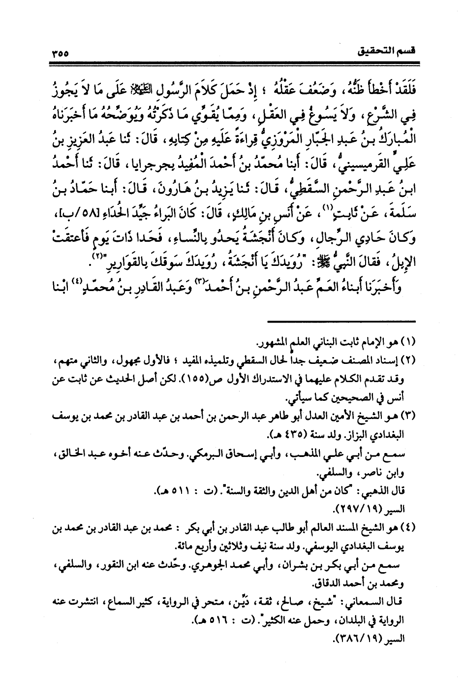 فلقد أخطأ ظنُّه، وضعفَ عقله إذْ حمل كلامَ الرسولِ، عليه السلام على ما لا يجوز في الشرع، ولا يسوغُ في العقل. ومما يُقوّي ما ذكرتُه ويوضِّحه ما أخبرناهُ المباركُ بنُ عبدِ الجبّارِ المَرْوَزي، قراءةً عليه من كتابه، قال: ثنا عبدُ العزيز بنُ عليّ القرميسينيّ، قال: أنبأ محمّد بنُ أحمد