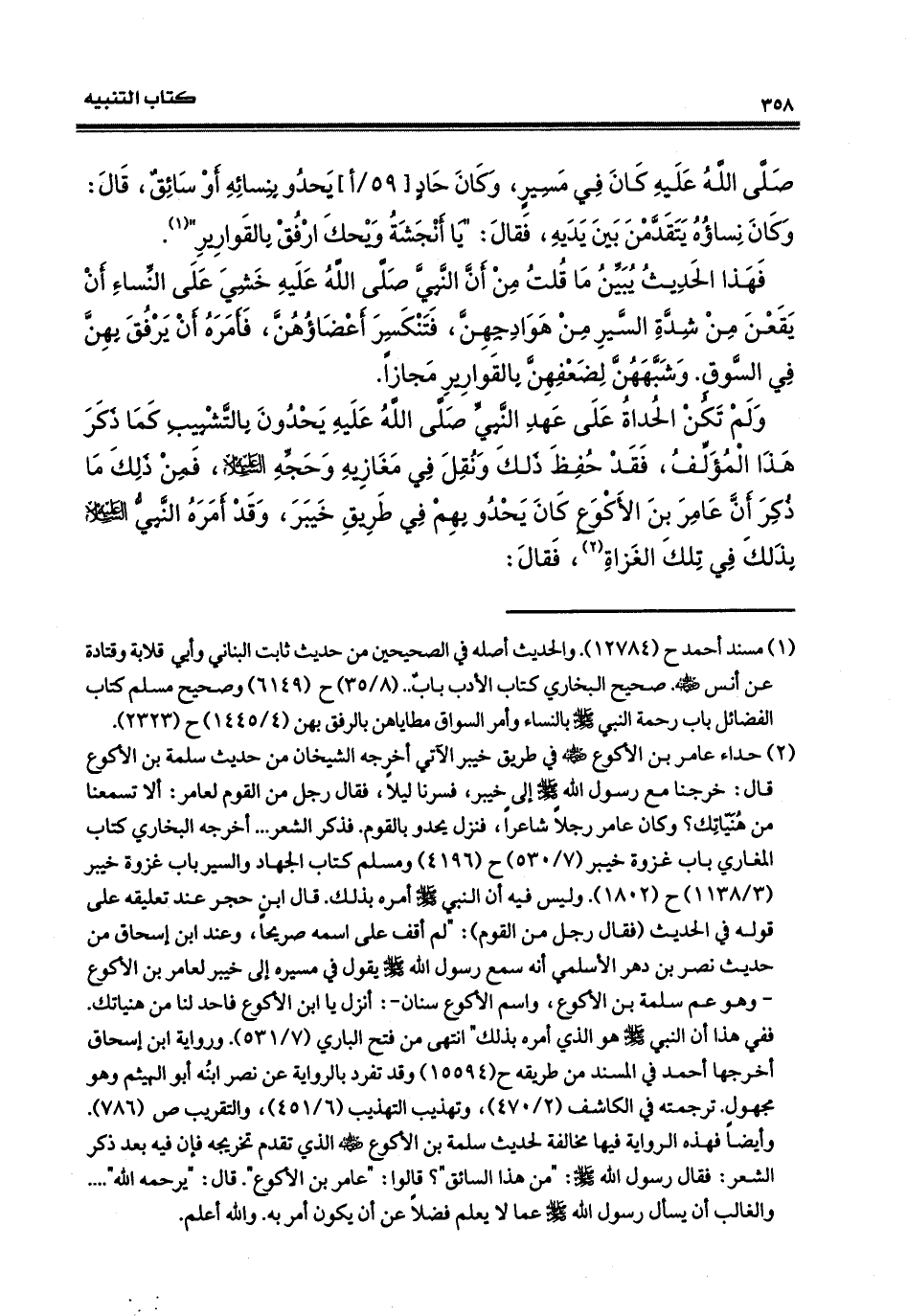 فهذا الحديث يبيّن ما قلتُ منْ أن النبيّ صلى الله عليه وسلم، خشيَ على النساء أنْ يقَعْنَ منْ شدّة السّير من هوادجهنّ فتنكسر أعضاؤهنّ، وأمره أنْ يرفقَ بهنّ في السَّوقِ، وشبّههنَ لضعفهنّ بالقوارير مجازاً. ولم تكن الحُداة على عهدِ النبيّ، صلى الله عليه وسلم، يحدونَ بالتشبيبِ كما ذكرَ هذا المؤلفُ، فقد حفظ ذلك ونُقلَ في مغازيه وحِجّه عليه السّلامُ، فمن ذلك ما ذكر أنّ عامرَ بنَ الأَكْوَع كانَ يحدو بهمْ