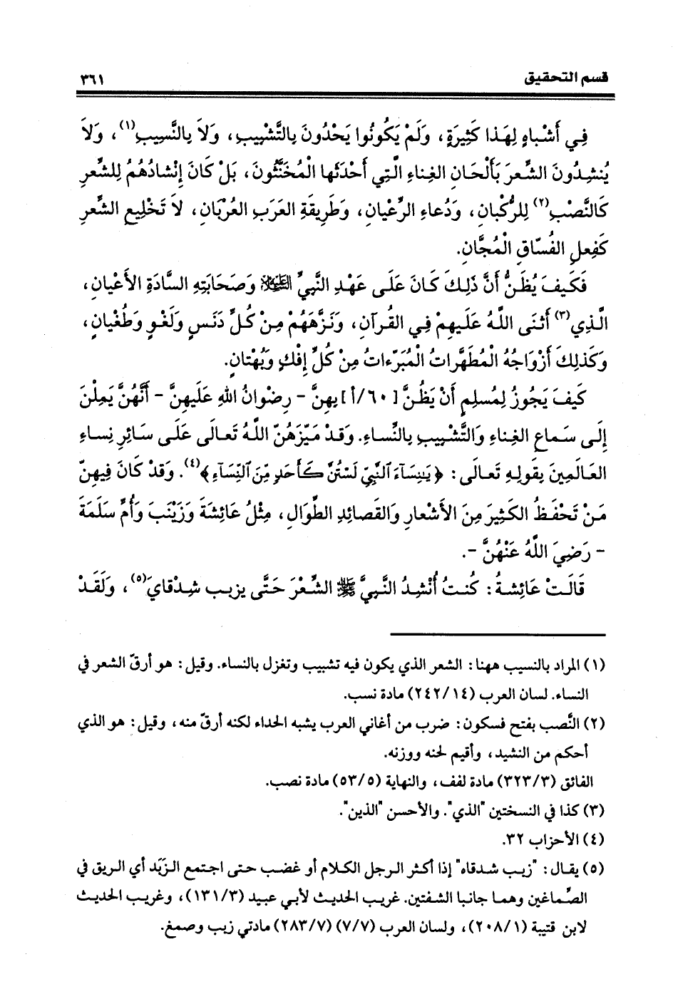 في أشباهٍ لهذا كثيرة، ولم يكونوا يحدون بالتشبيب ولا بالنّسيبِ، ولا يُنْشِدون الشعرَ بألحانِ الغناءِ التي أَحْدَثَها المخَنَّثون، بل كان إنشادُهم للشعرِ كالنَّصبِ للركبانِ، ودعاء الرعيانِ، وطريقة العربِ العُرْبان، لا تخليعَ الشعر كفعلِ الفُسَّاقِ المجان، فكيف يظنّ أنَّ ذلك كان، على عهد النبيّ، عليه السّلام وصحابته الأعيان، الذين أثنى الله عليهم في القرآن، ونزّههم من كل دنَسٍ ولغوٍ وطُغيان، وكذلك أزواجه المطهّرات المبرآت منْ كل ِّ إفكٍ وبُهْتان؟ فكيف يجوز لمسلمٍ أنْ يظنّ بهنّ، رضوانُ الله عليهنَّ، أنَّهنَّ يَمِلْنَ إلى سماع الغناءِ والتشبيبِ بالنساءِ، وقد ميّزهنّ الله تعالى على سائر نساءِ العالمينَ بقوله تعالى: (يا نساءَ النبيّ لستُنَّ كأحدٍ من النِّساء) وقد كانَ فيهنَّ من تحفظُ الأشعارَ والقصائدَ الطوالَ، مثلَ عائشةَ وزينب وأمّ سلمةَ، رضي الله عنهنّ؟ قالت عائشةُ: كنتُ أنشدُ النبيّ، صلى الله عليه وسلم، الشعرَ حتى يزبِّب شِدْقايَ. ولقد