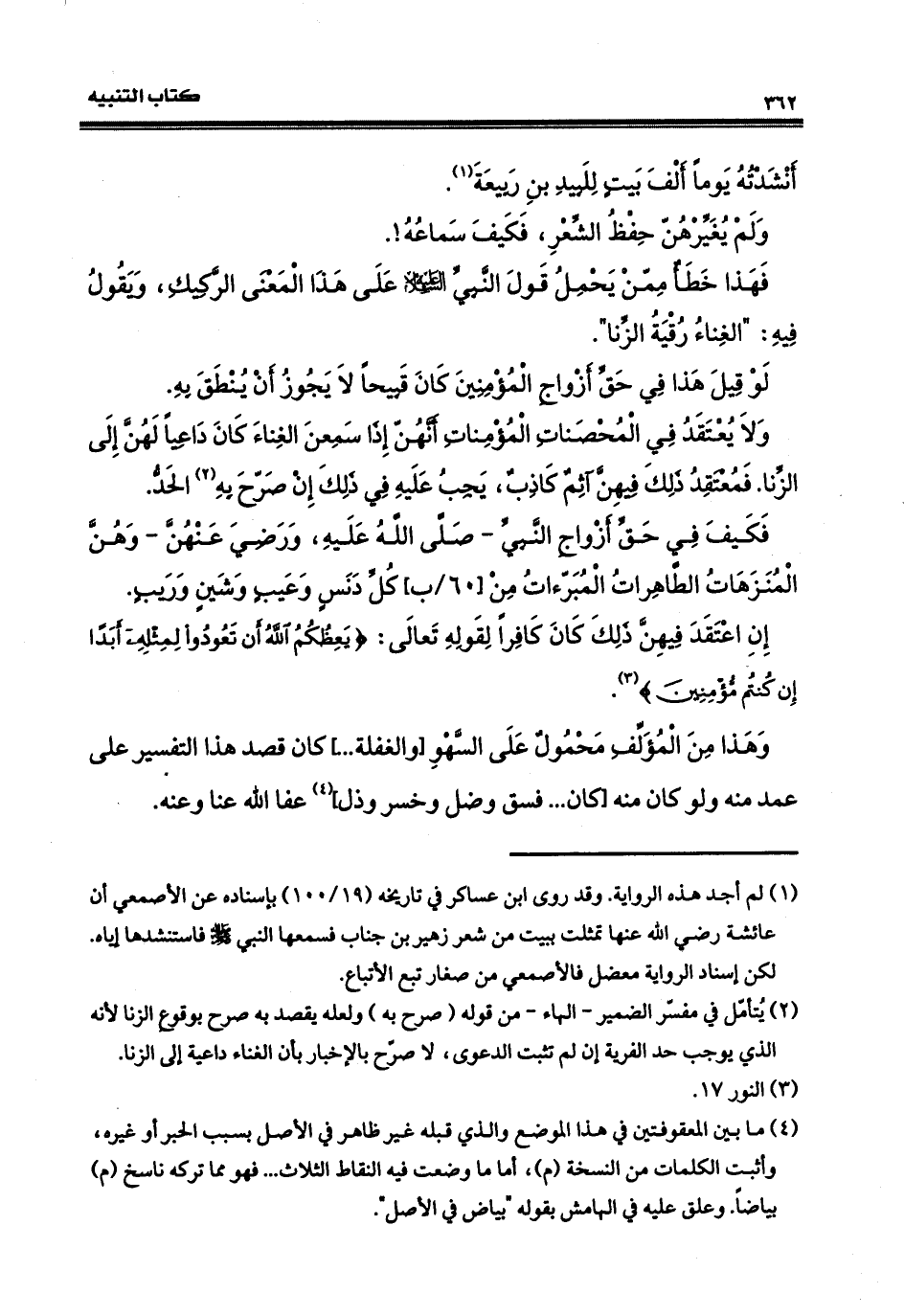 المعنى الركيكِ، ويقولً فيه: الغِناء رقيةُ الزِّنى. لو قيلَ هذا في حقِّ أزواجٍ المؤمنين كان قبيحاً لا يجوز أن ينطقَ به، ولا يعتقدُ في المحصناتِ المؤمناتِ أنّهنَّ إذا سمعْنَ الغناءَ كانَ داعياً لهنّ إلى الزّنى، فمُعتقدُ ذلك فيهنّ آثمٌ كاذبٌ يجبُ عليه في ذلك إن صرّح به الحدّ، فكيف في حقِّ أزواج النبيّ، صلى الله عليه وسلم ورضيَ عنهنّ، وهنّ المنزّهات الطاهراتُ المُبرآتُ منكل دنسٍ وعَيْب، وشَيْنٍ ورَيْب، إن اعتقدَ فيهنّ ذلك كان كافراً، لقوله تعالى: (يَعِظُكُمَ الله أنْ تعودوا لِمِثْله أبداً إن كُنْتُم مؤمنين) فهذا مِنَ المؤلّف مَحْمولٌ على السَّهوِ والغَفْلةِ. . . وإن قصد إلى هذا التفسير عمد منه. . . فسق وضل، وخسر وذل، عفا الله عنا وعنه.