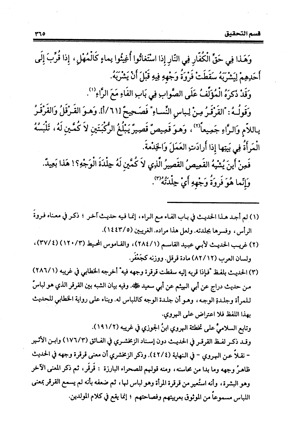 وهذا هو في حقِّ الكفّار في النارِ إذا استغاثوا أُغيثوا بماءٍ كالمُهل، إذا قُرِّبَ إلى أحدِهم ليشربَه سقطتْ فروةُ وَجْهِه فيه قبل أن يشربه. وقد ذكرهُ المؤلف على الصواب في باب (الفاءِ مع الراء). وقوله: القَرْقَرْ من لباسِ النساء فصيحٌ وهو القَرقَل والقَرْقر، باللامِ وبالراء جميعاً، وهو قميصٌ قصيرُ يبلغ الركبتين، لا كمِّين له تلبسه المرأة في بيتها إذا أرادت العمل والخدمة، فمن أين يشبه القميص الذي لا كمين له جلدة الوجه؟ هذا بعيدٌ، إنّما هو فَرْوةُ وجهه، أي: جِلدته.