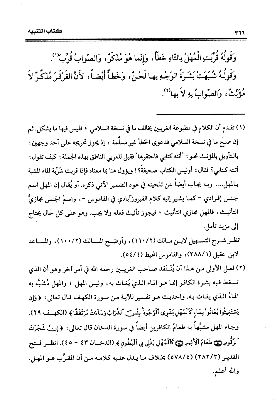 وقوله: قُرِّبتِ المهلُ، بالتاء خطأ، وإنّما هو مذكر لا مؤنث. والصواب: قُرّب وقوله: شُبِّهتْ بشرةُ الوجهُ بها لحنٌ وخطأ أيضاً، لأن القَرقَر مذكّر لا مؤنّث، والصواب بهِ لا بها.