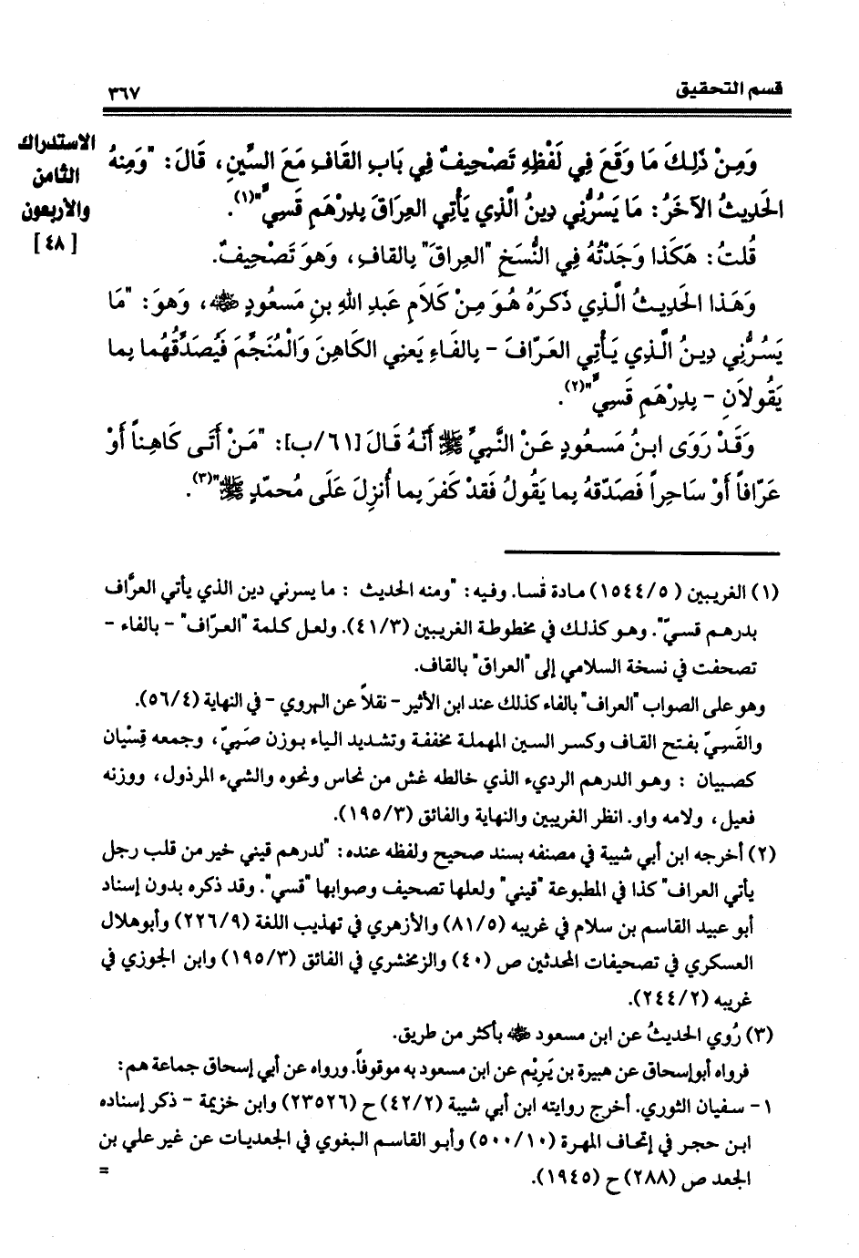 قلت: هكذا وجدته في النسخ العِراق، بالقاف، وهو تصحيفٌ، وهذا الحديث الذي ذكره هو منْ كلام عبدِ الله بنِ مسعودٍ، رضيَ الله عنه: ما يسّرني دينُ الذي يأتي العرّاف، بالفاء، يعني الكاهنَ والمِنجّم فيصدّقهما بما يقولان بدرهمٍ قسيٍّ.