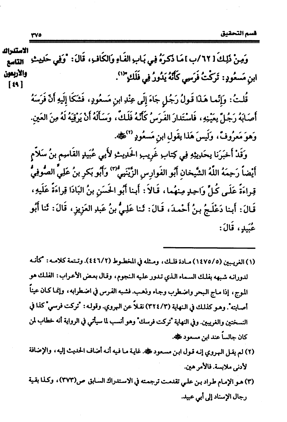 قلت: وإنما هذا في قول رجل جاء إلى عند ابن مسعود فشكا إليه أن فرسه أصابه رجل بعينه فاستدار فرسه كأنه فلك وسأله أن يرقيه له من العين، وهو معروف. وليس هذا بقول ابن مسعود، رضي الله عنه، وقد أخبرنا بحديثه في كتاب غريب الحديث لأبي عبيد القاسم بن سلاّم أيضاً، رحمه الله، الشيخان أبو الفوارس الزينبي، وأبو بكر بن علي الصوفي قراءة على كل واحد منهما، قالا: أنبأ أبو الحسين بن البادا قراءة عليه، قال: أنبأ دعلج بن أحمد، قال: ثنا علي بن عبد العزيز، قال: ثنا أبو عبيد، قال: