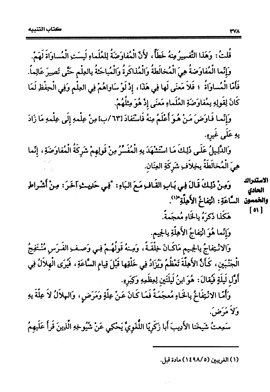 قلتُ: وهذا التفسيرُ منهُ خَطأٌ، لأنَّ المفاوضةَ للعلماءِ ليست المساواةَ لهمْ وإنَّما المفاوضةُ هي: المخالطةُ والمذاكَرةُ والمباحثَة للعلم حتّى يصير عالماً. فأمّا المساواة فلا معنى في هذا، وإنما فاوضَ مَنْ هو أعلمُ منه فاستفادَ من علمهِ إلى علمهِ ما زادَ به على غيرهِ. والدليلُ على ذلكَ ما استشهد به المفسرّ مِنْ قولهمْ: شركةُ المفاوضةِ، إنَّما هي المخالطةُ بخلافِ شركة العِنَان.