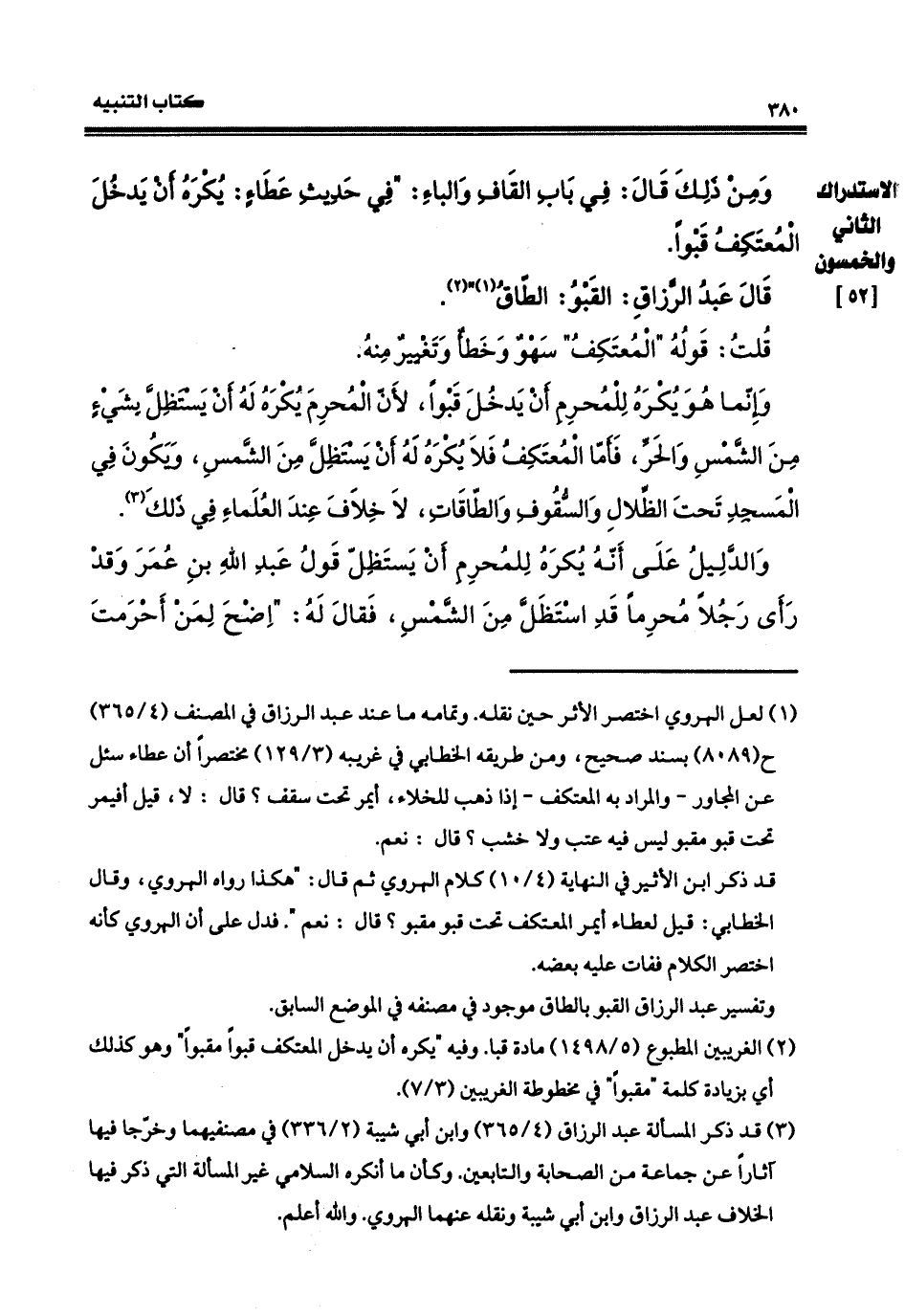 قلت: قوله: المعتكف سهو منه وخطأ وتغيير منه، وإنما هو يُكْرَه للمحرم أنْ يدخلَ قبواً، لأنّ المحرم يكره له أن يستظلّ بشيءٍ من الشمس والحر. فأما المعتكف فلا يكره له يستظلّ مِنَ الشمس ويكون في المسجد تحتَ الظلالِ والسقوف والطاقات، لا خلافَ عند العلماء في ذلك، والدليل على أنّه يكره للمحرم أن يستظلّ. قولُ عبد