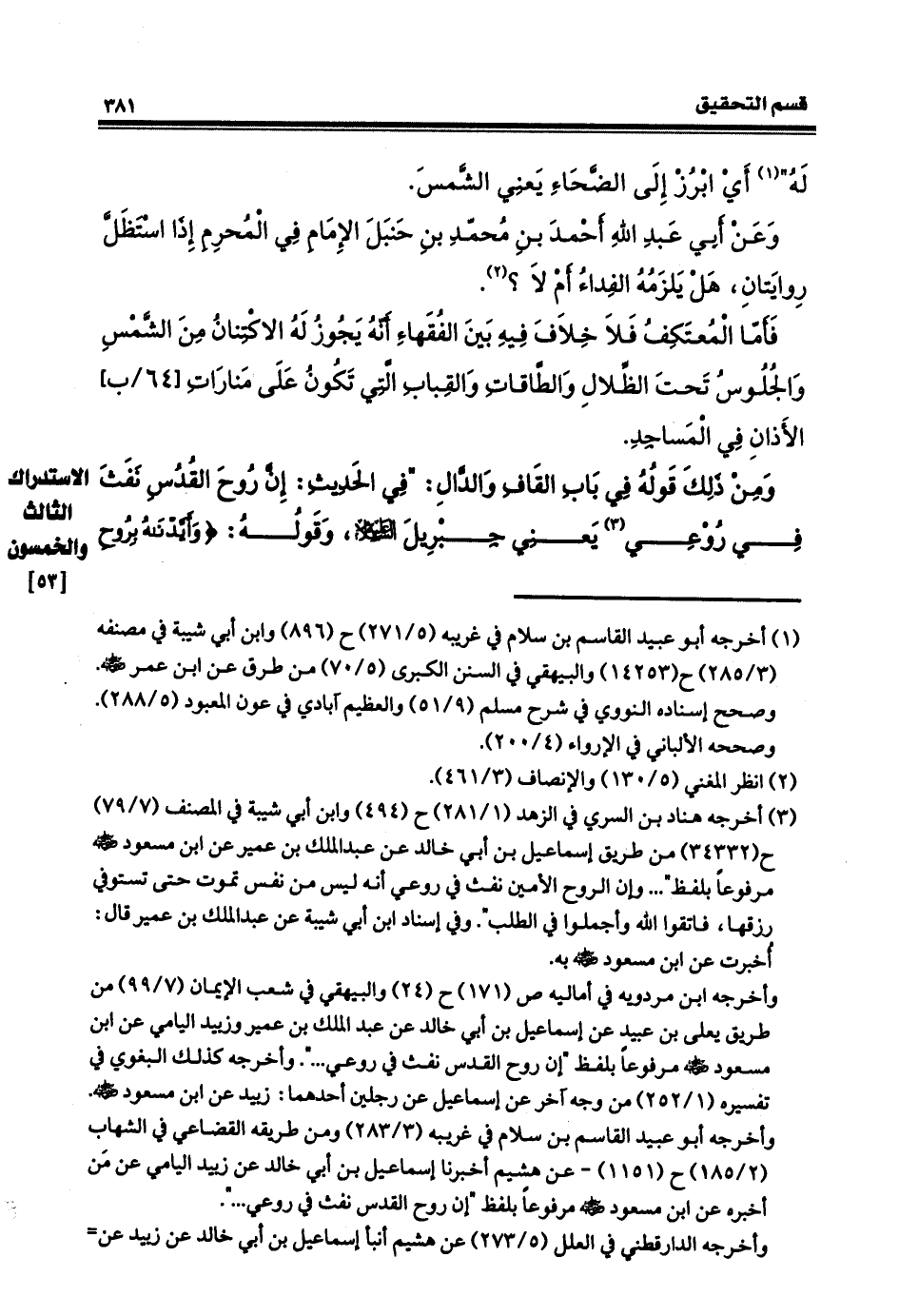 ومن ذلك قوله في باب: (القاف والدال) في الحديث: أنَّ روح القدس نفث في روعي، يعني جبريل عليه السلام. وقوله: (وأيَّدناهُ بروح