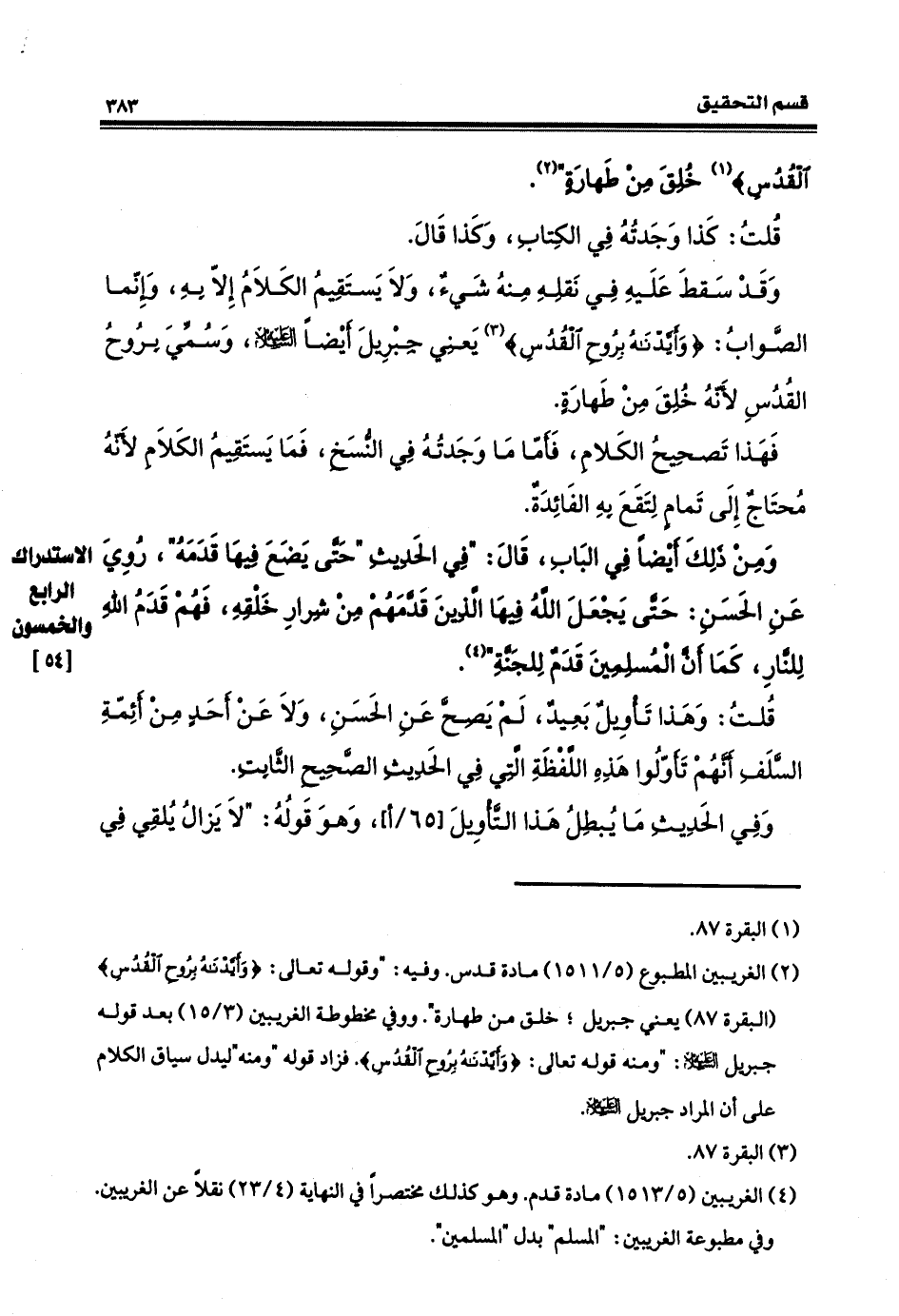 قلت: كذا وجدتهُ في الكتاب وكذا قال. وقد سقط عليه في نقله منه شيء، ولا يستقيم الكلام إلا به، وإنما الصواب: (وأيّدناه بروح القُدُس)، يعني جبريل أيضاً عليه السلام، وسُمّي بروح القدس لأنه خلق من طهارة. فهذا تصحيح الكلام، فأمَّا ماوجدته في النسخ فما يستقيم الكلام لأنه محتاج إلى تمامٍ لتقع به الفائدة.