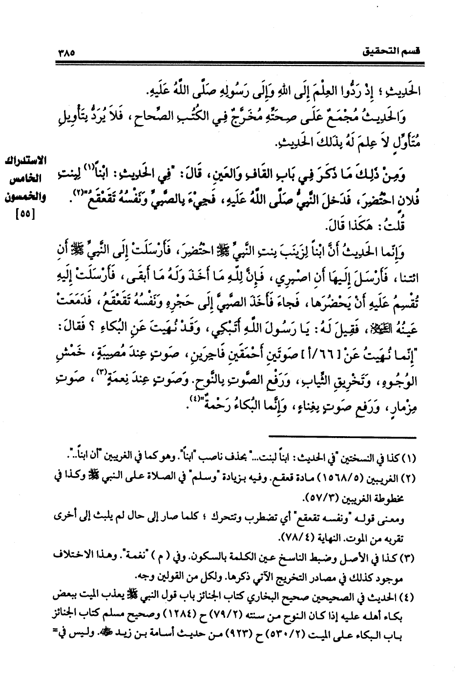 قلت: هكذا قالَ، وإنّما الحديث أن ابناً لزينب بنت النبيّ، صلى الله عليه وسلم، احتُضِرَ فأرسلت إلى النبيّ، صلى الله عليه وسلم، أنِ ائتِنا. فأرسل إليها: أنِ: اصبري فإنّ لله ما أَخَذّ ولهُ ما أبْقى.