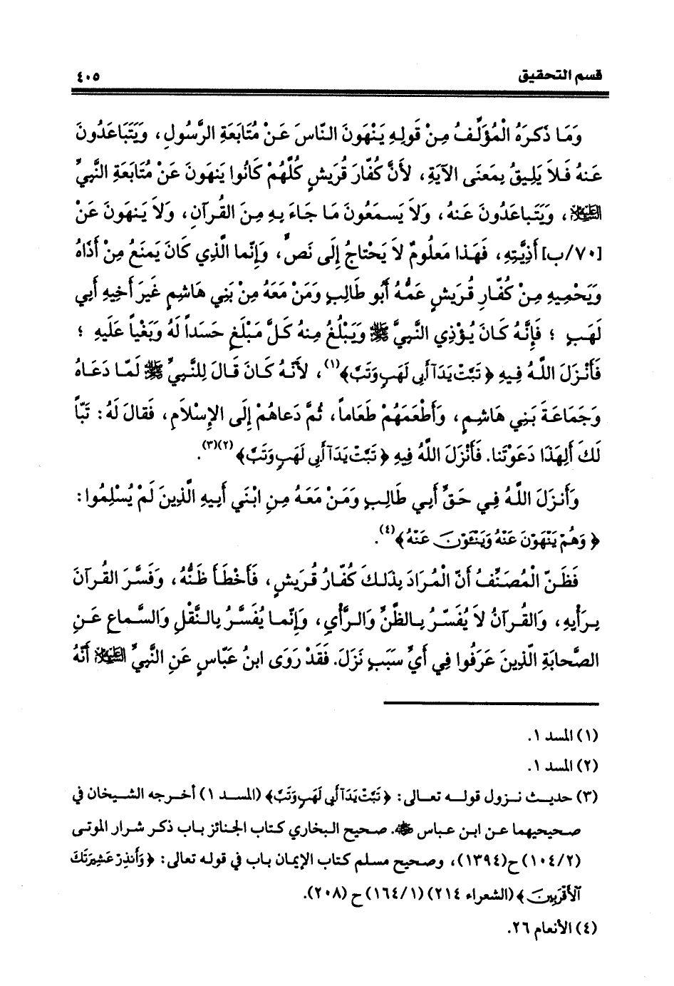 وإنّما الذي كانَ يمنعُ من أذاهُ ويحميهِ من كفّارِ قريشٍ، عَمَّه أبو طالبٍ، ومَنْ معهُ مِنْ بني هاشمٍ، غير أخيه أبي لهب، فإنّه كان يؤذي النبيّ، صلى الله عليه وسلم، ويبلغُ منهُ كلّ مبلغٍ لهُ، ونعياً عليه، فأنزل الله فيه: (تبّت يدا أبي لهبٍ وتَبّ) لأنّه كانَ قالَ للنبيّ، صلى الله عليه وسلم، لمّا دعاهُ وجماعةَ بني هاشمٍ أطعمهم طعاماً، ثمّ دعاهم إلى الإسلام، فقال له: تبّاً لكَ ألهذا دَعَوْتَنا؟. فأنزل الله فيه (تبّت يدا أبي لهبٍ)، وأنزل في حقِّ أبي طالب ومن معه من بني أبيه الذين لم يسلموا وهم ينهون عنه وينأون عنه، فظنَّ المصنّف أنَّ المرادَ بذلكَ كفّار قريشٍ، فأخطأ ظنّه، وفسّر القرآن برأيهِ، والقرآن لا يُفسّر بالظنّ والرأي، وإنّما يفسّر بالنقل والسماعِ عنِ الصحابةِ الذينَ عرفوا في أي سبب نزلَ. فقد روى ابن عباس عن النبيّ، عليه السلام، أنّه