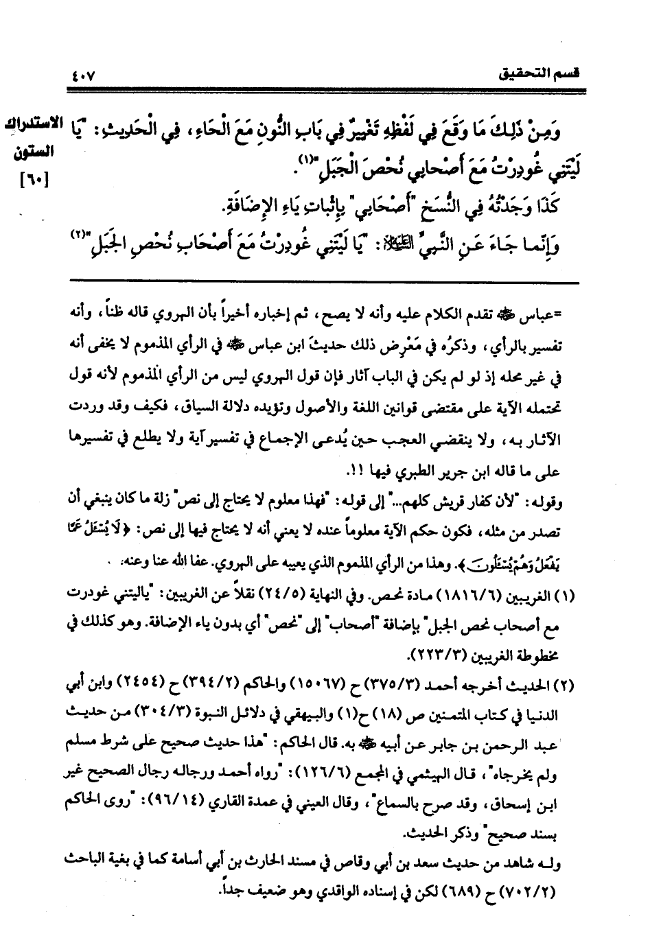 غُوْدِرتُ معَ أصحابي نُحْصَ الجبل. كذا وجدته في النسخ أصحابي، بإثبات ياء الإضافة. وإنما جاء عنِ النبيِّ عليهِ السَّلامُ: يا ليتني غُودِرتُ معَ أصحابِ نُحْصِ الجبلِ،