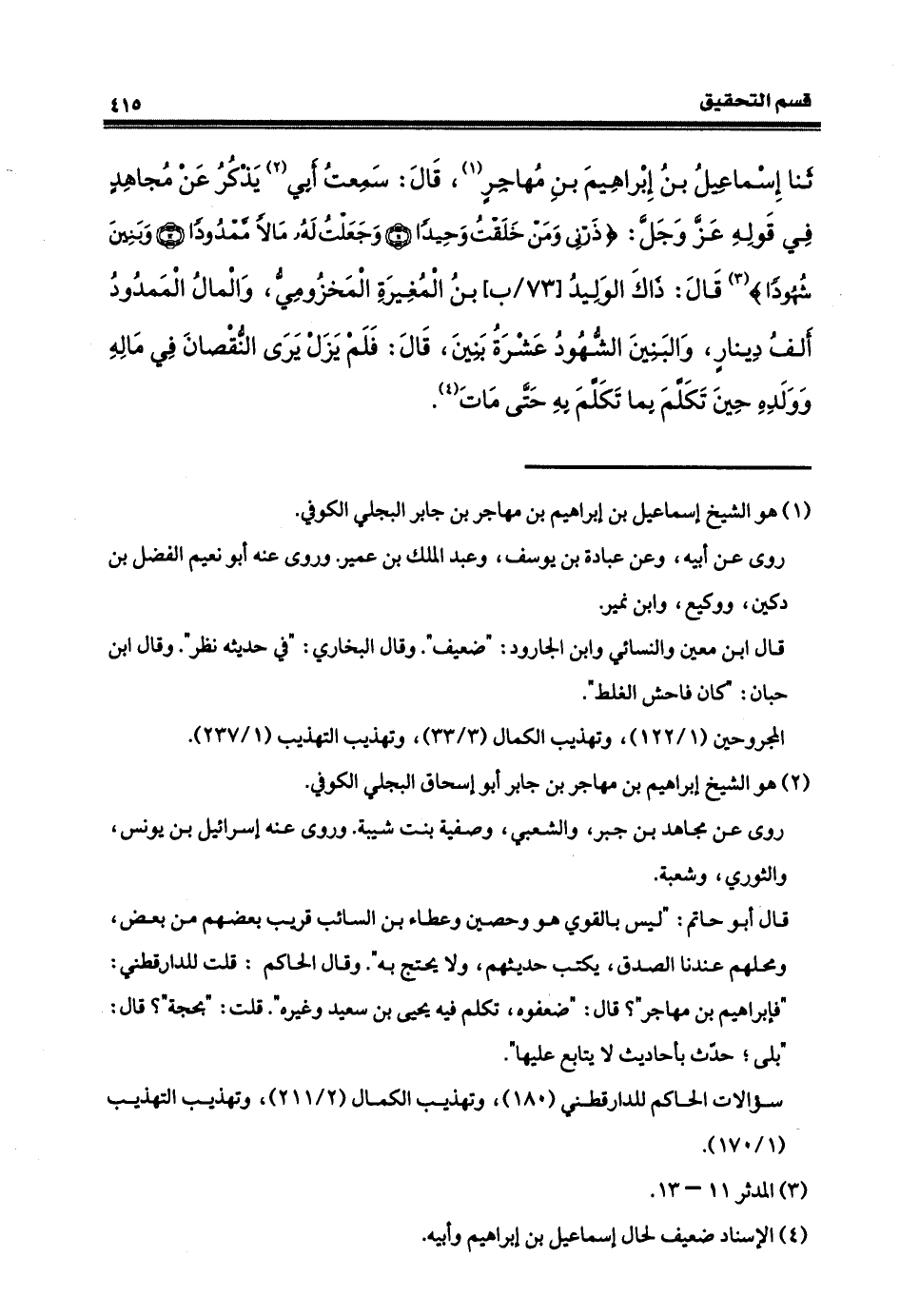 ثنا إسماعيلُ بنُ إبراهيمَ بن مهاجر، قال: سمعتُ أبي يذكر عن مجاهد في قوله عزّ وجل: (ذَرْني ومَنْ خلقتُ وحيداً، وجعلتُ له مالاً ممدوداً وبنينَ شهوداً) قال: ذاك الوليد بن المغيرة المخزوميّ. والمال الممدود: ألف دينارٍ، والبنين الشهود. عشرة بنينَ. قال: فلمْ يزلْ يرى النقصانَ في ماله وولده حين تكلّم بما تكلّم به حتّى مات.