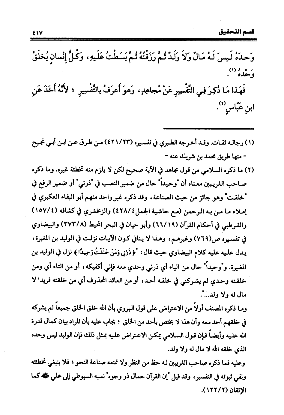وحده، ليس له مال ولا ولد، ثمّ بسطتُ عليه، وكلُّ إنسانٍ يخلُق وحدهُ، فهذا ما ذكر في التفسير عنْ مُجاهِدٍ، وهو أعرفُ بالتفسيرِ، لأنّه أخذَ عن ابنِ عبّاس.