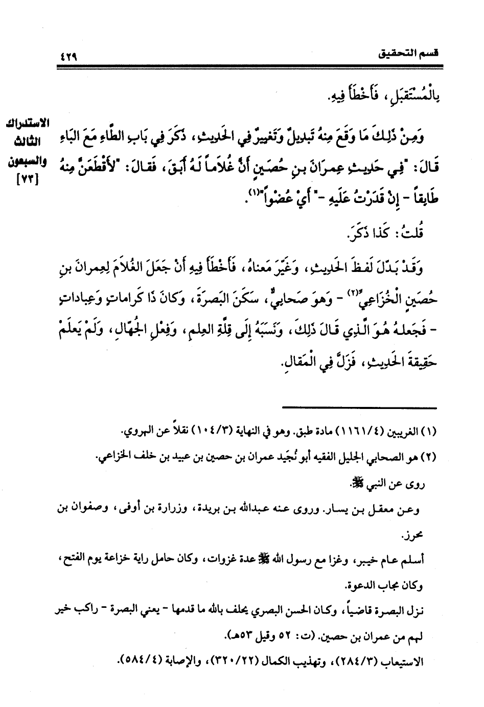 قلت: كذا قال، وقد بدّل لفظ الحديث وغيّر معناه، فأخطأ فيه أن جَعل العلامَ لعمران بن حصين الخُزاعي، وهو صحابي سكن البصرة، وكان ذا كرامات وعبادات، فجعله هو الذي قال ذلك ونسبه إلى قلة العلم وفعل الجهّال، ولم يعلمْ حقيقة الحديث فزلّ في المقال.