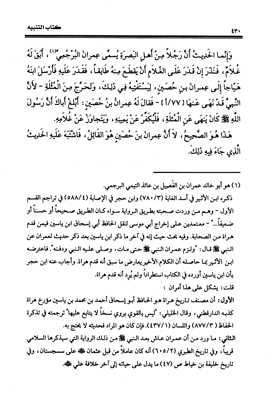 وإنّما الحديثُ: أنّ رجلاً من أهل البصرةِ يُسمّى عمران البرجُميّ أبقَ غلامٌ فنذر إن قَدَر على الغلام أن يقطع منه طابقاً، فقدرَ عليه فأرسل ابنه هيّاجاً إلى عمرانَ بنِ حُصَيْنٍ: ليستفتيه في ذلك، وتحرّج من المَثُلة لأنّ النبيّ قد نَهَى عنها فقال له عمران بنُ حُصَيْن: أبلغ أباك أنّ رسولَ الله، صلى الله عليه وسلم، كانَ يَنهى عن المَثَلة فليكفِّر عن يمينه ويتجاوز عن غلامِه. هذا هو الصحيح، لا أنّ عمران بن
