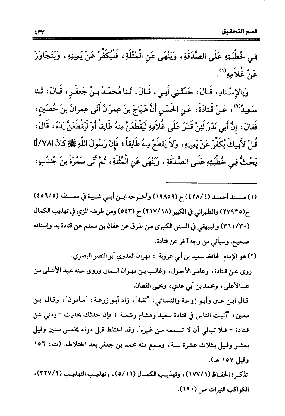 وبالإسناد قالَ: حدّثني أبي قال: ثنا محمّد بن جعفر، قال: ثنا سعيد عن قتادة، عن الحسن، أن هياج بنُ عمران أتى عمران بنَ حُصَيْن فقال: إن أبي نذَر لئِن قدرَ على غلامِه ليقطعنّ منه طابقاً، أو ليقطعنّ يده، قال: قل لأبيك يكفّر عن يمينه ولا يقطع منهُ طابقاً، فإن رسول الله، صلى الله عليه وسلم، كان يحثّ في خطبته على الصدقة، وينهى عن المَثُلة، ثم أتى سمرة بن جندبٍ
