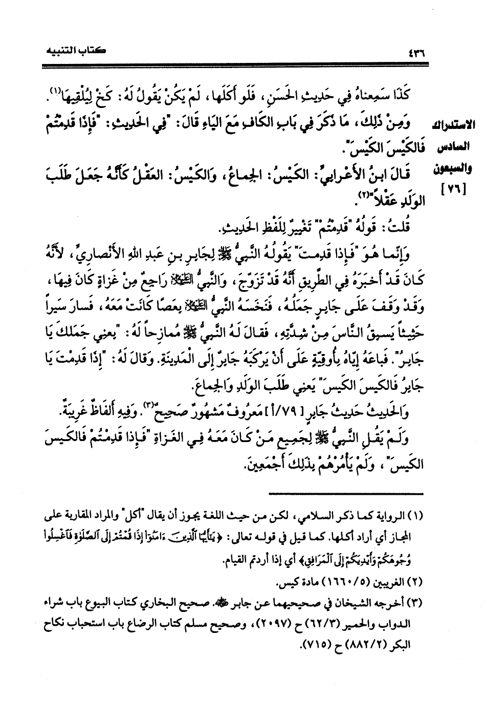 والحديث حديث جابر معروفٌ مشهور صحيح، وفيه ألفاظ غريبة. ولم يقل النبيّ، صلى الله عليه وسلم، لجميع مَن كانَ معهُ في الغزوة: فإذا قدمتّم فالكَيْسَ الكَيْسَ، ولم يأمرهم بذلك أجمعين،