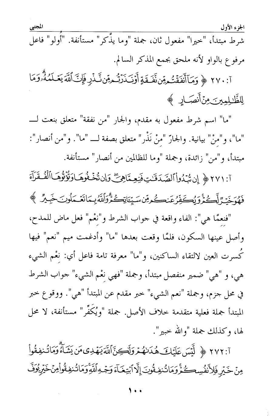 جملة «ولكن الله يهدي» معطوفة على جملة «ليس عليك هداهم» لا محل لها. و «ما» في قوله «وما تنفقوا» اسم شرط جازم مفعول به، والجار «من خير» متعلق بنعت لـ «ما» ، والجار «فلأنفسكم» متعلق بخبر محذوف لمبتدأ محذوف أي: فهو لأنفسكم. والواو في قوله «وما تنفقون» اعتراضية، والجملة اعتراضية، و «ابتغاء» مفعول لأجله، وجملة «وأنتم لا تظلمون» حالية، وجملة «وما تنفقوا» الثانية معطوفة على جملة «وما تنفقوا» الأولى.