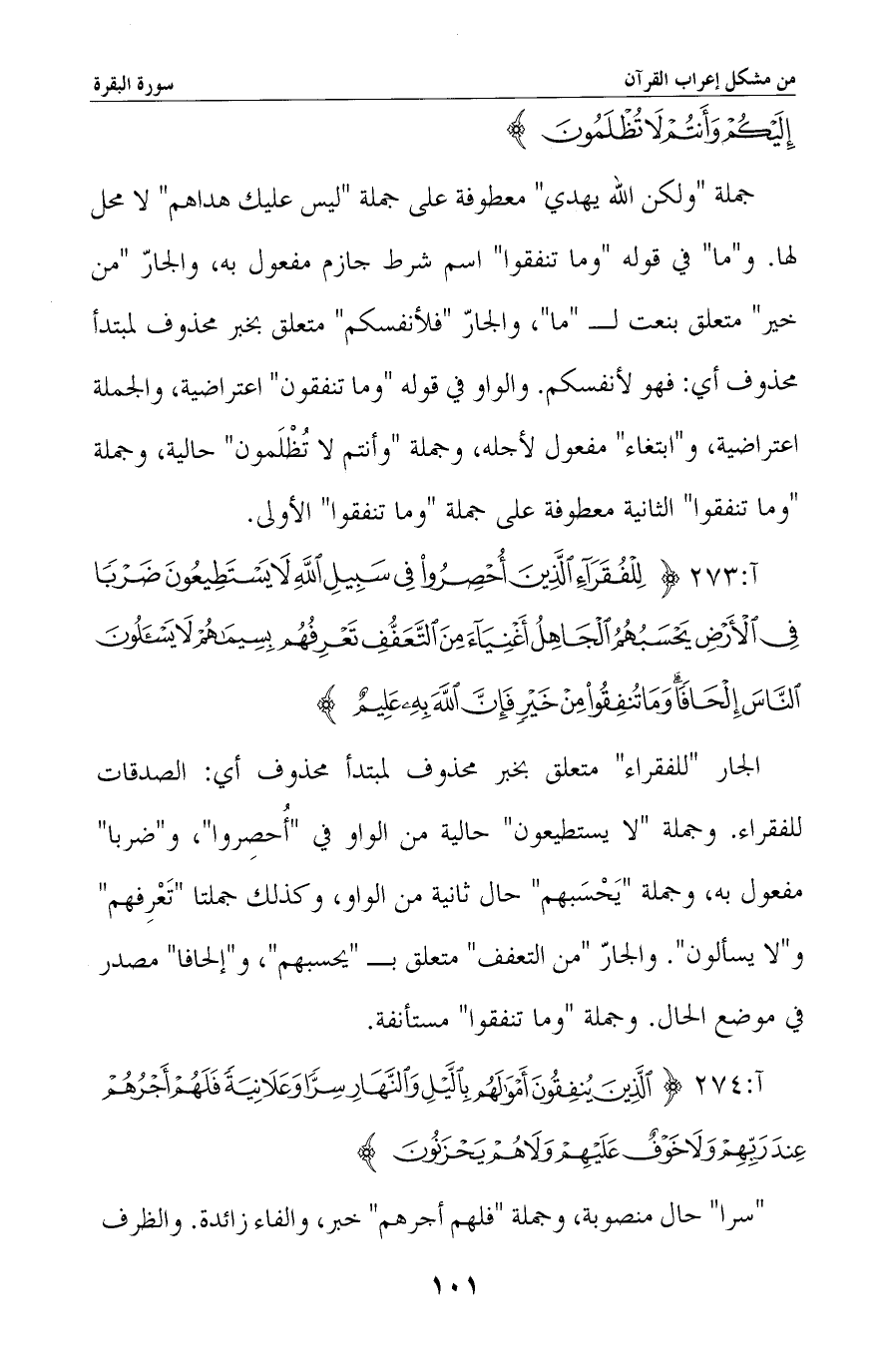 الجار «للفقراء» متعلق بخبر محذوف لمبتدأ محذوف أي: الصدقات للفقراء. وجملة «لا يستطيعون» حال من الواو في «أُحصِروا» و «ضربا» مفعول به، وجملة «يحسبهم» حال ثانية من الواو، وكذلك جملتا «تعرفهم» و «لا يسألون» . والجار «من التعفف» متعلق بـ «يحسبهم» ، و «إلحافا» مصدر في موضع الحال. وجملة «وما تنفقوا» مستأنفة.