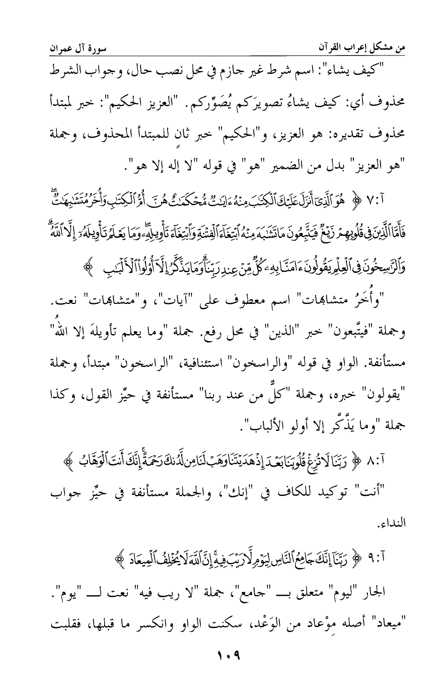 «وأُخَر متشابهات» اسم معطوف على «آيات» ، و «متشابهات» نعت. وجملة «فيتبعون» خبر «الذين» في محل رفع. جملة «وما يعلم تأويله إلا الله» مستأنفة. الواو في قوله «والراسخون» استئنافية، «الراسخون» مبتدأ، وجملة «يقولون» خبره، وجملة «كل من عند ربنا» مستأنفة في حيز القول، وكذا جملة «وما يَذَّكَّر إلا أولو الألباب» .