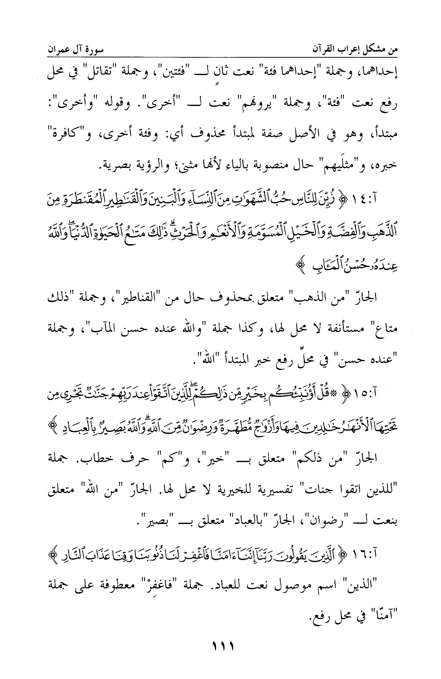 الجار «من ذلكم» متعلق بـ «خير» ، و «كم» حرف خطاب. جملة «للذين اتقوا جنات» تفسيرية للخيرية لا محل لها. الجار «من الله» متعلق بنعت لـ «رضوان» ، الجار «بالعباد» متعلق بـ «بصير» .