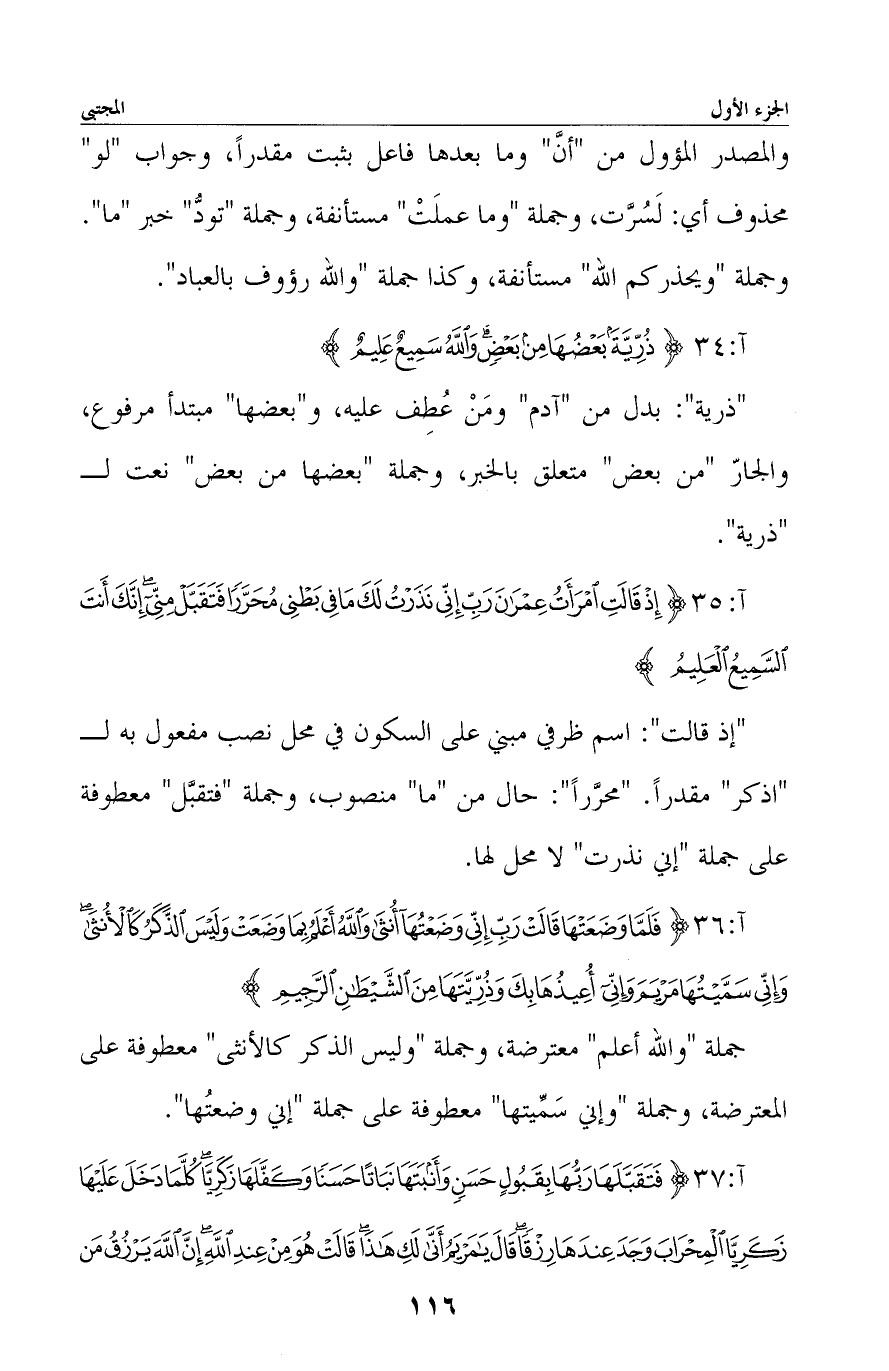«إذ قالت» : اسم ظرفي مبني على السكون في محل نصب مفعول به لـ «اذكر» مقدرًا. «محرَّرًا» : حال من «ما» منصوب، وجملة «فتقبَّل» معطوفة على جملة «إني نذرت» لا محل لها.