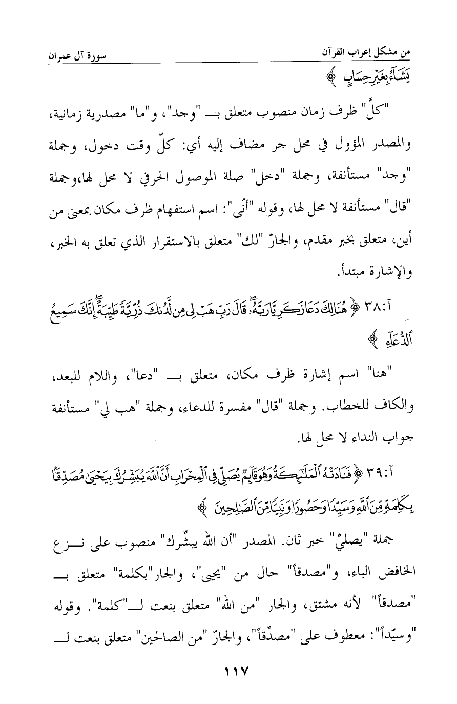 جملة «يصلي» خبر ثان. المصدر «أن الله يبشرك» منصوب على نزع الخافض الباء، و «مصدقًا» حال من «يحيى» ، والجار «بكلمة» متعلق بـ «مصدقًا» ، والجار «من الله» متعلق بنعت لـ «كلمة» . وقوله «وسيّدًا» : معطوف على «مصدقًا» ، والجار «من الصالحين» متعلق بنعت لـ -[118]- «نبيًا» .