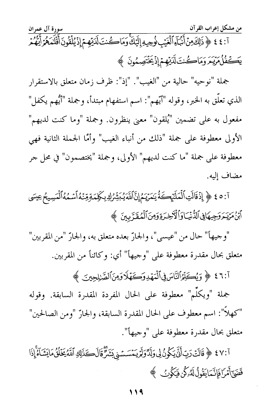 جملة «نوحيه» حال من «الغيب» . «إذ» : ظرف زمان متعلق بالاستقرار الذي تعلّق به الخبر، وقوله «أيّهم» : اسم استفهام مبتدأ، وجملة «أيهم يكفل» مفعول به على تضمين «يُلقون» معنى ينظرون. وجملة «وما كنت لديهم» الأولى معطوفة على جملة «ذلك من أنباء الغيب» وأما الجملة الثانية فهي معطوفة على جملة «ما كنت لديهم» الأولى، وجملة «يختصمون» في محل جر مضاف إليه.