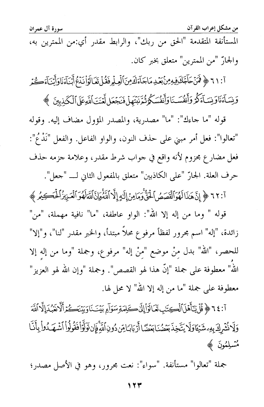 جملة «تعالوا» مستأنفة. «سواء» : نعت مجرور، وهو في الأصل مصدر؛ -[124]- ولذلك لم يُؤَنَّث. «بيننا» : ظرف مكان متعلق بالمصدر (سواء) . والمصدر «ألا نعبد» خبر لمبتدأ مقدر بـ «هي» .